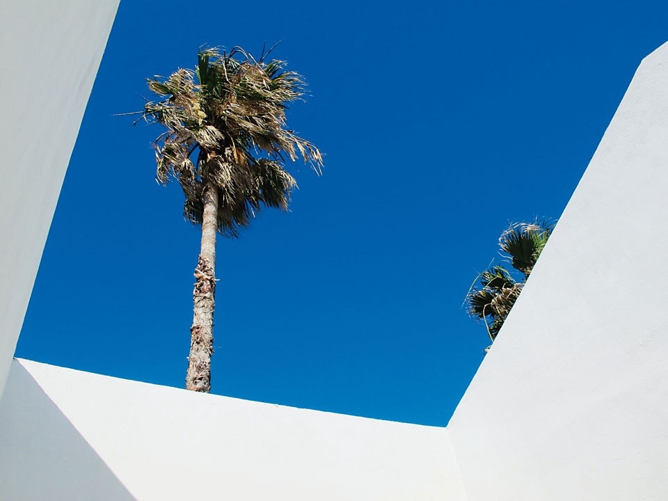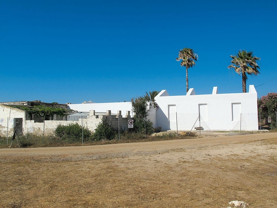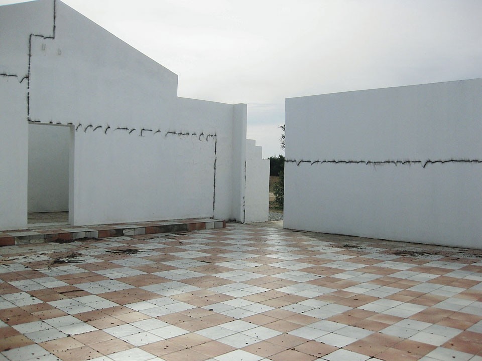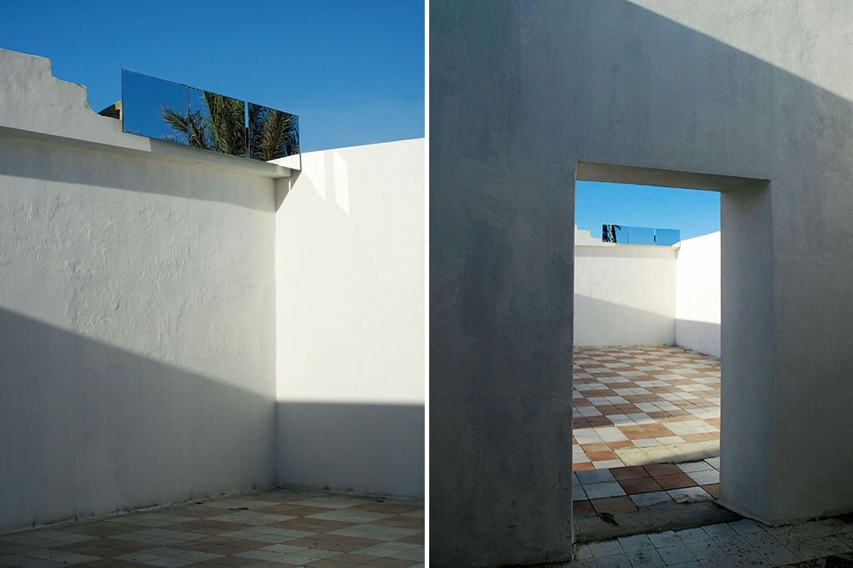A pochi passi, un’antica torre di guardia e un bunker sopravvissuto alla Seconda guerra mondiale ricordano il passato militare dell’isola. Dopo aver messo a fuoco le due costruzioni, ecco apparire altre strutture — vecchi magazzini, caserme abbandonate, edifici che riprendono i toni smorzati della vegetazione circostante. Mentre la luce tagliente sembra amplificare il contrasto tra i pochi colori presenti, improvvisamente gli occhi sono attirati da alcuni abbaglianti contorni bianchi, che emergono oltre i cespugli. Avvicinandosi, il loro perimetro si apre in un abbacinante volume bianco, privo di tetto, porte e finestre, la cui mancanza rende alieni i nitidi profili angolari. Una stradina di ghiaia conduce all’interno, dove una grande stanza candida lascia spazio al cielo turchese. Seguono altri tre ambienti di dimensioni minori, tutti con pavimenti a mattonelle, e qua e là residui di precedenti strati di colore: verde, grigio, blu. In alto, solo il cielo, incorniciato dagli implacabili bordi bianchi della struttura. È come se James Turrell fosse atterrato in Sardegna.