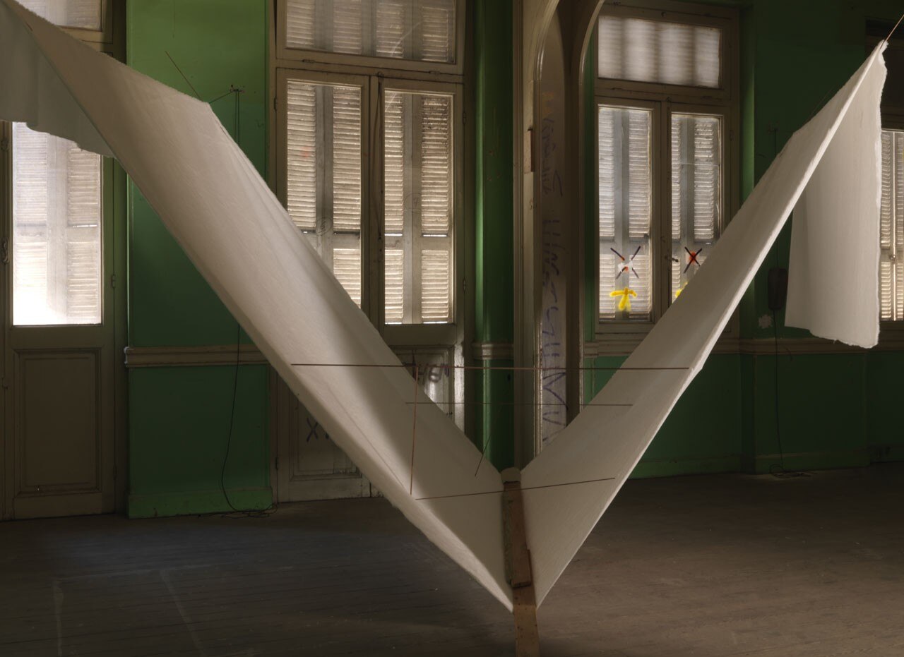 A metà tra il bozzetto e l’allusione queste opere definiscono nuovi rapporti architettonici con l’edificio, sono la presenza di un’assenza, una materialità differita che in qualche modo riecheggia l’attuale condizione di sospensione avvertibile in tutta Atene.