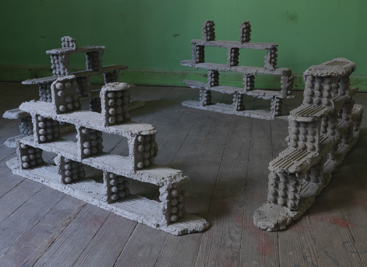 Una proposta che dialoga intenzionalmente con le molte stratificazioni costantemente presenti nella stupefacente, immensa, diroccata sede di Kunsthalle Athena, non solo perché l’edificio reca le tracce delle sue trascorse funzioni e destinazioni, ma anche per la presenza della deliberata scelta di conservare un’opera di ciascuna mostra e di trasformarla nell’elemento costitutivo di una specie di vetrina permanente che a poco a poco cresce e occupa lo spazio.