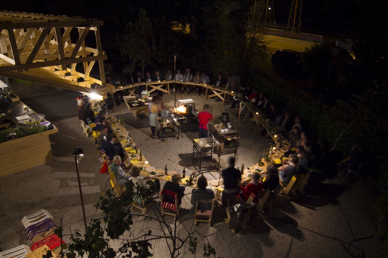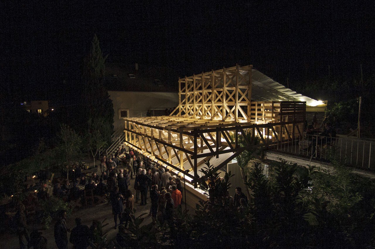 Gasthaus: Fin dalle prime riflessioni sul progetto, esisteva il desiderio di creare un formato che non fosse auto-celebrativo, ma piuttosto ci desse la possibilità di mettere in discussione le domande e i temi che arrivano dalla nostra pratica di curatori e designer. Le relazioni con i contesti sociali e geografici, la produzione culturale e un approccio multidisciplinare al progetto, sono gli elementi che accomunano i progetti realizzati in questi dieci anni. ll progetto Gasthaus appena inaugurato è in linea con la riflessione legata alla transdisciplinarità tra il design, l'architettura, la pianificazione urbana, l'arte e la teoria. La maggior parte dei curatori, degli artisti e dei designer invitati a “Lungomare Gasthaus” ha sviluppato un lavoro inedito in stretto dialogo con i curatori del progetto. L'architettura temporanea dello spazio realizzata dal collettivo ConstructLab/EXYZT si ispira alle rovine di un teatro del mare. Nella parte inferiore della struttura in legno è collocata la cucina aperta della trattoria e nella parte superiore si apre un palcoscenico polifunzionale.