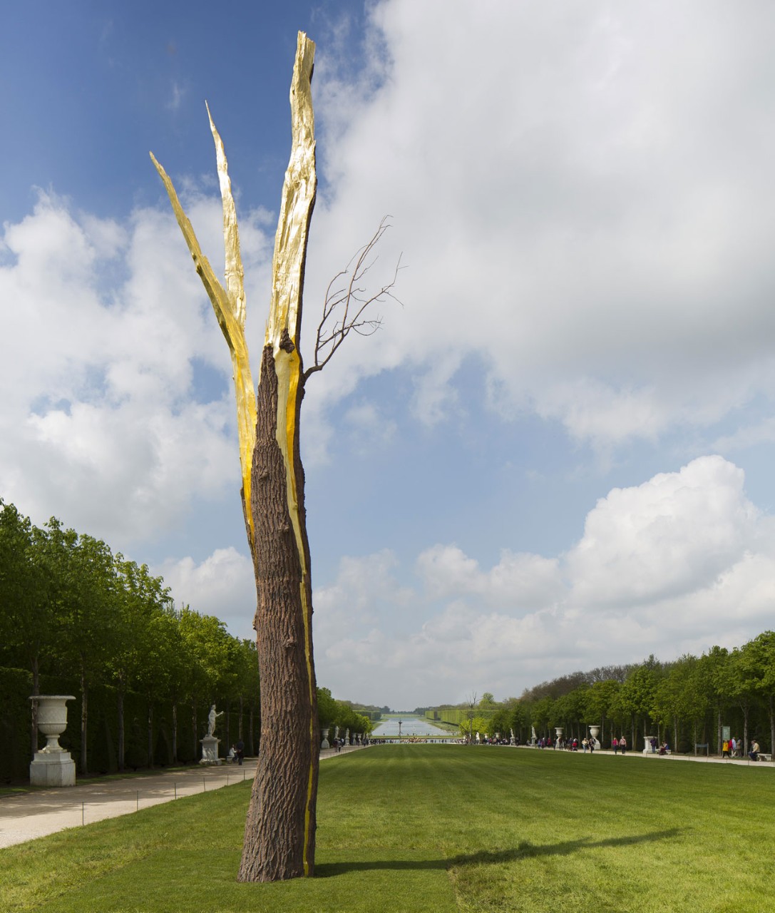 Penone sfida con l’incanto la dismisura del luogo. A Versailles, tutto è piccolo ma nel luogo di rappresentazione di un’idea di dominio occorre trovare un controsistema di lettura. Penone fa propria l’intuizione di Giacometti, la prospettiva centrale diventa come un’unica base su cui assemblare sculture di taglie differenti. Triplice, l’albero folgorato riprodotto in oro e bronzo, il cui disegno di pietre in bilico taglia ai margini la prospettiva e Le foglie delle radici (2011) sembrano schizzate di getto, nel vuoto o, come precisa l’artista stesso, nel bianco di una visita invernale al castello.