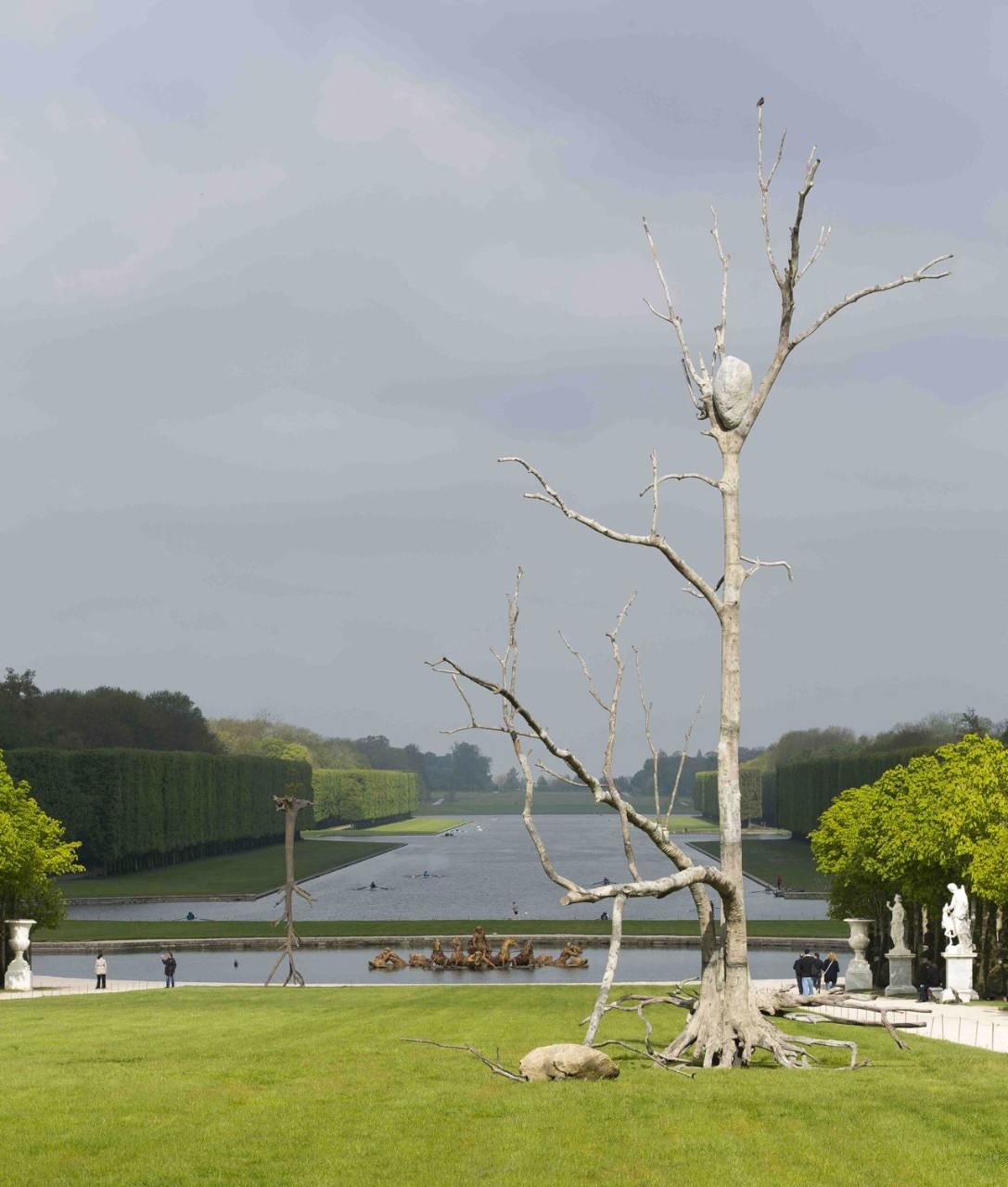 Il gesto regale è invertito dalla sua umiltà quasi monastica di artista povero (o poverista) che, come in una contromossa di energia cosmica e atemporale, rivela la forma artificiale dell’esproprio aristocratico sulla natura. È anche il più bell’omaggio ai quattrocento anni dalla nascita di André Le Nôtre, il grande artista di giardini che incanalò l’afflato egoista del sovrano nella visione paesaggistica mozzafiato della sua prospettiva centrale, ritmandone la massa vegetale con bacini, canali e giochi d’acqua.