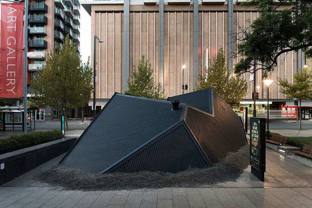 L’opera site-specific ripropone nel cortile dell’Art Gallery of South Australia l’immagine archetipica della villetta suburbana diffusa in Australia negli anni Venti. La casa, completamente dipinta di nero, sembra incastonata a terra dopo essere piovuta dal cielo.