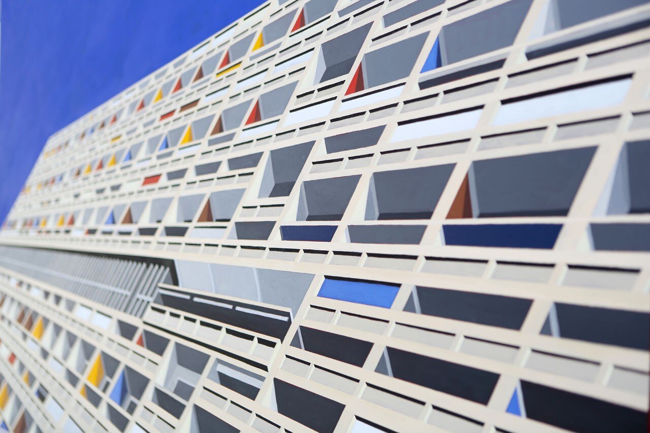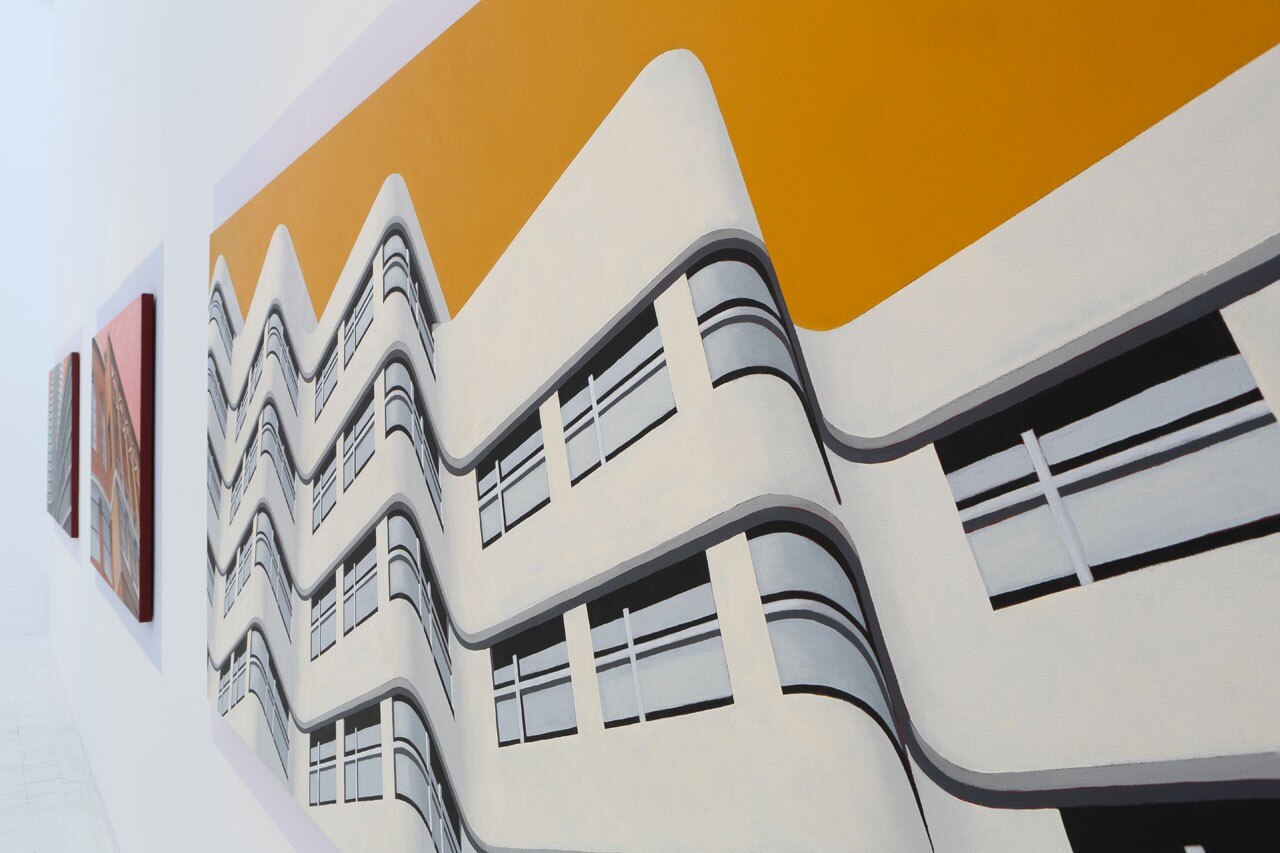 Negli anni, Petrus sposta sempre di più l’attenzione ai dettagli architettonici come vedesse gli edifici dietro una personalissima lente di ingrandimento: la modularità ripetuta di una griglia strutturale, l’andamento rotondo di certi balconi di Guido Canella, la vista zoomata di una facciata curva di Zaha Hadid, la texture di colori puri dell’Unité d’habitation di Le Corbusier. Ritorna, dopo anni di pittura a olio, il disegno a carboncino, a rendere ancora più profondi i neri delle ombre in facciata, sfumando con matita grassa i confini netti e puliti della Tour Méditerranée di Marsiglia.