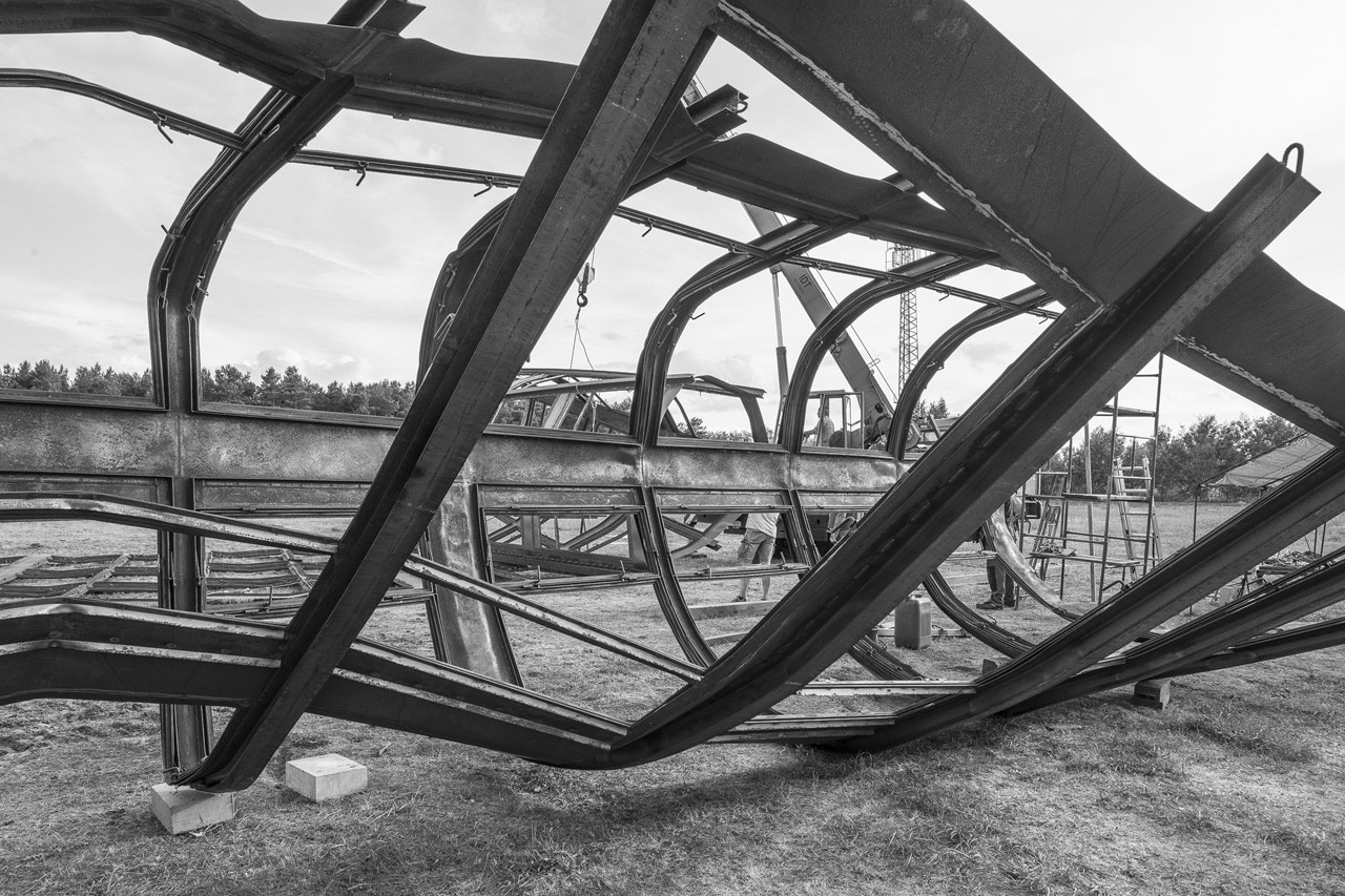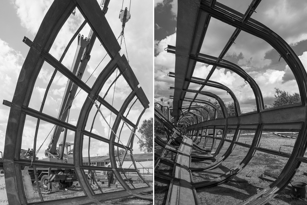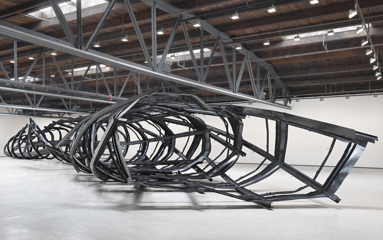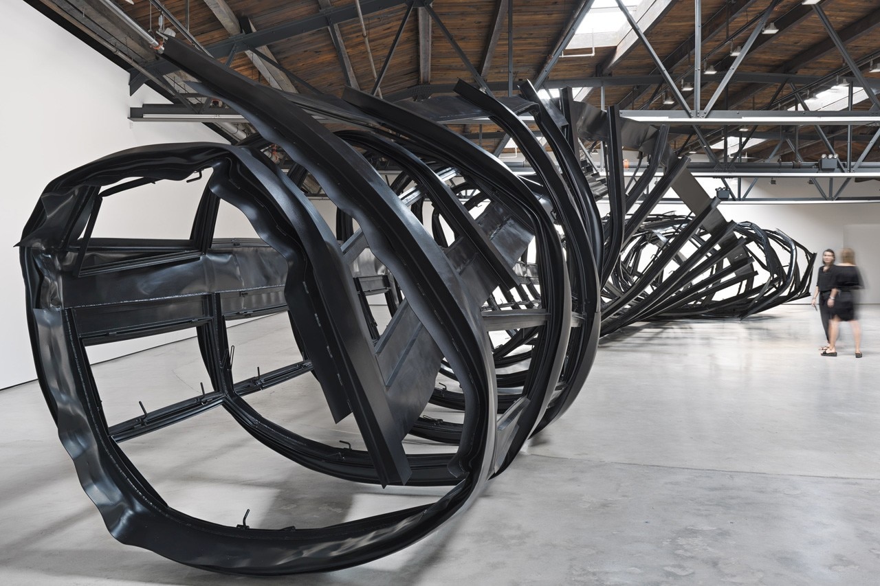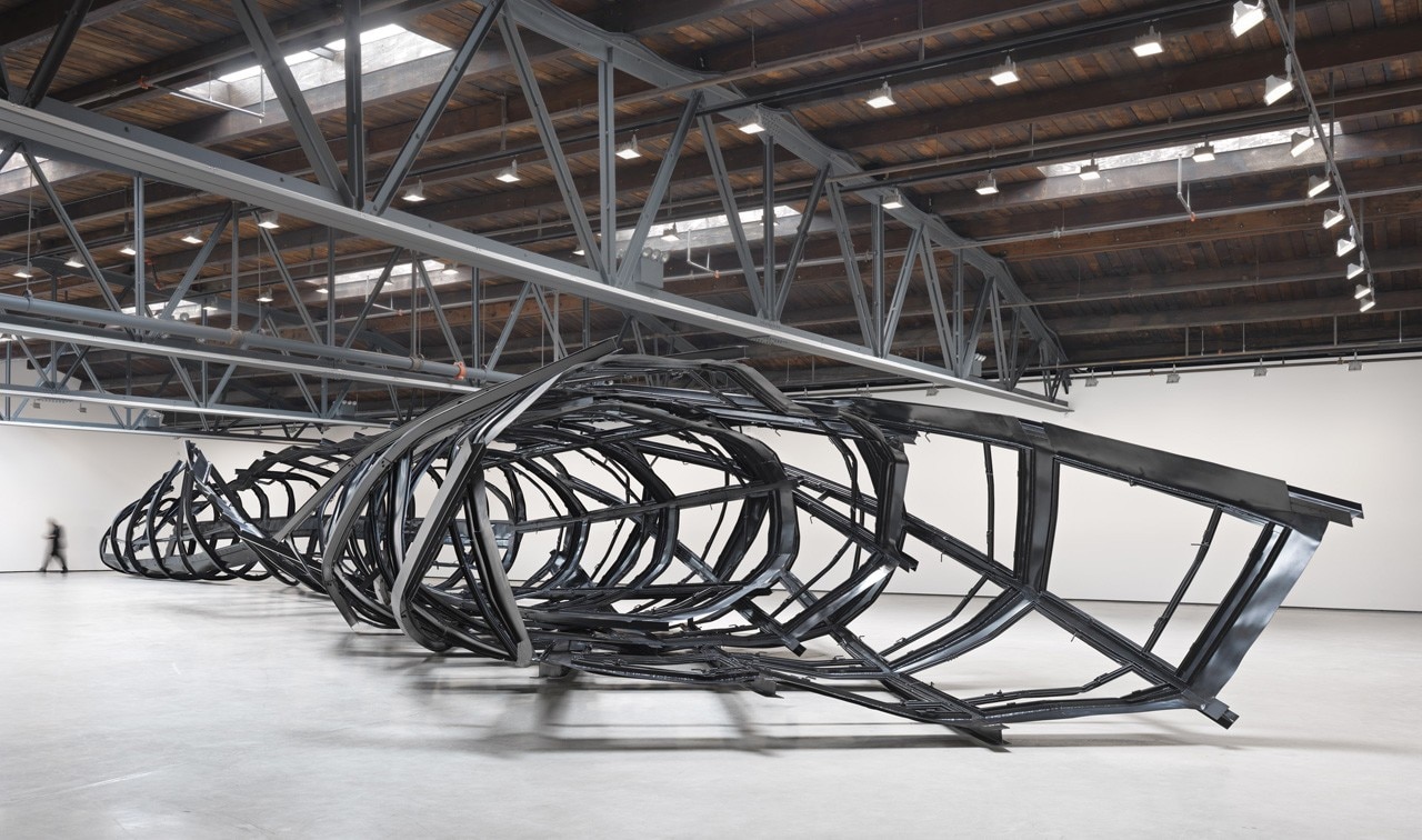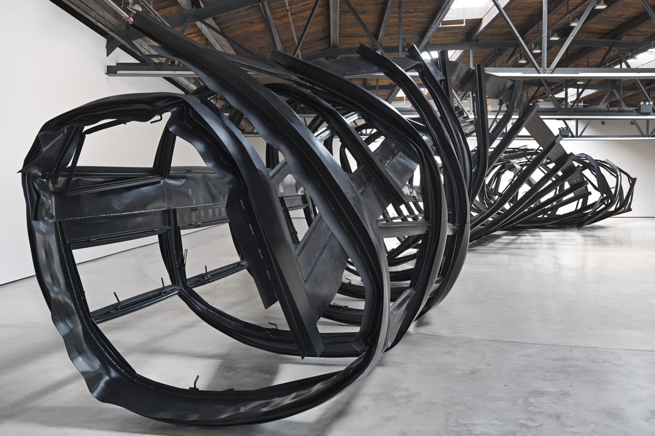 Sotto le sue mani gli snelli pannelli d’acciaio brunito si curvano, si torcono e si piegano allungandosi in un carcassa orizzontale lunga quasi 34 metri saldata insieme, che conserva particolari originali come le maniglie delle finestre. L’opera è suddivisa in due sezioni: nella prima una singola parete continua si incurva dispiegandosi in una galleria cilindrica, collegata perpendicolarmente a tre altre pareti continue sovrapposte l’una all’altra in una forma cilindrica molto più aerea, attraverso la quale si può osservare l’interno della parte terminale della scultura