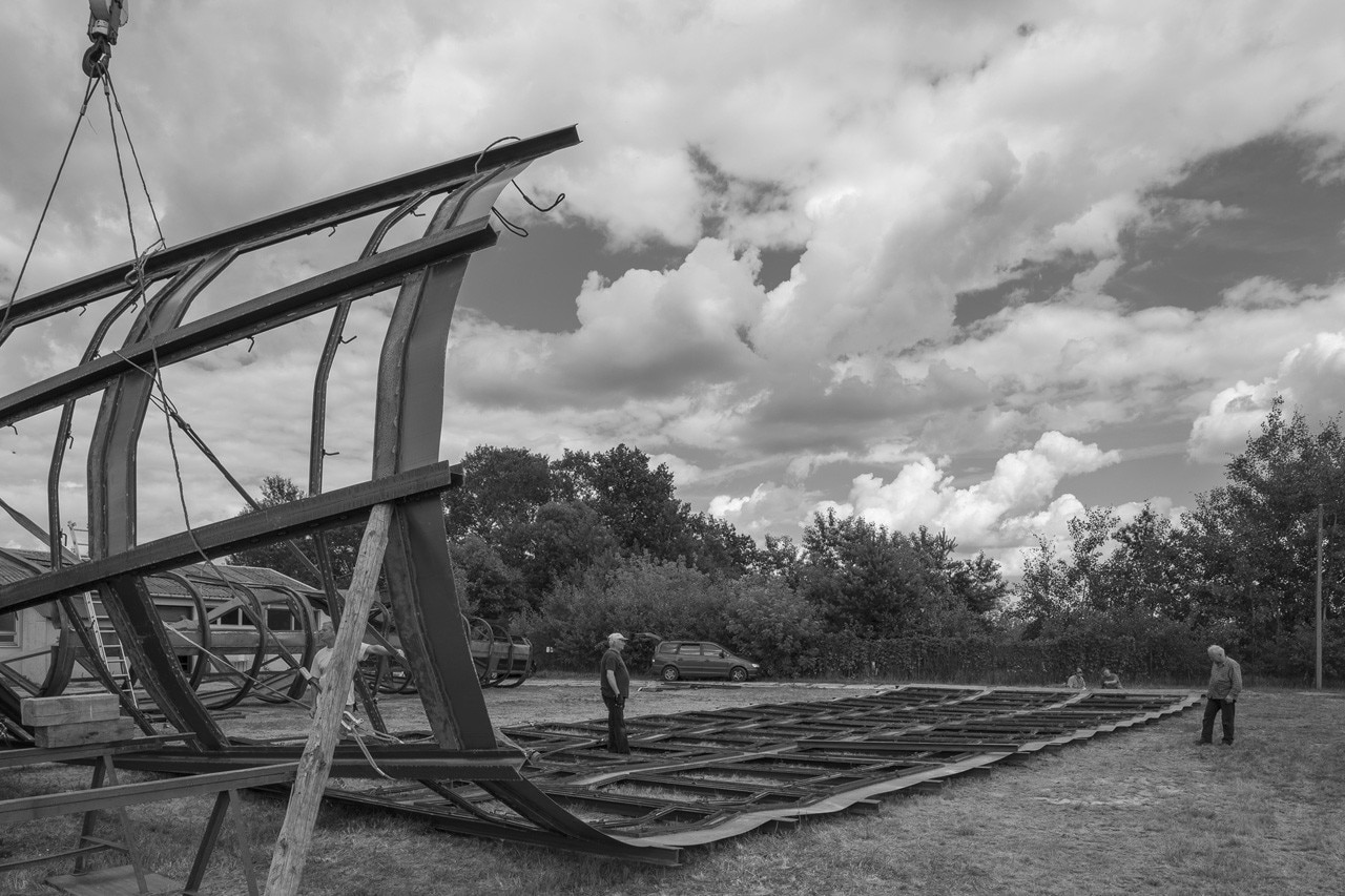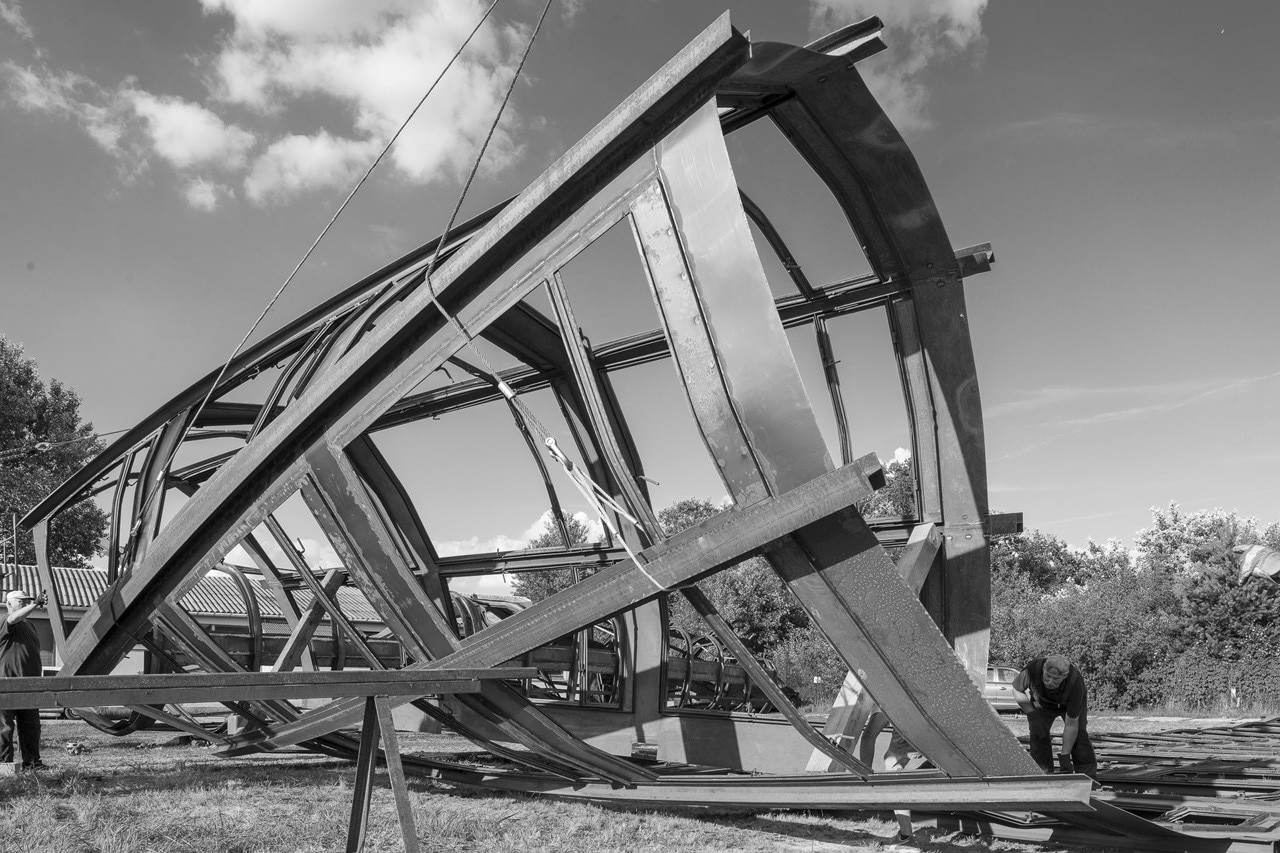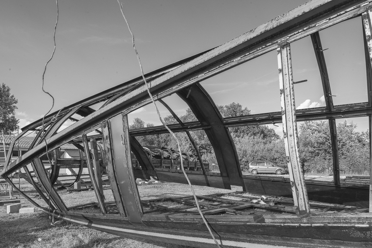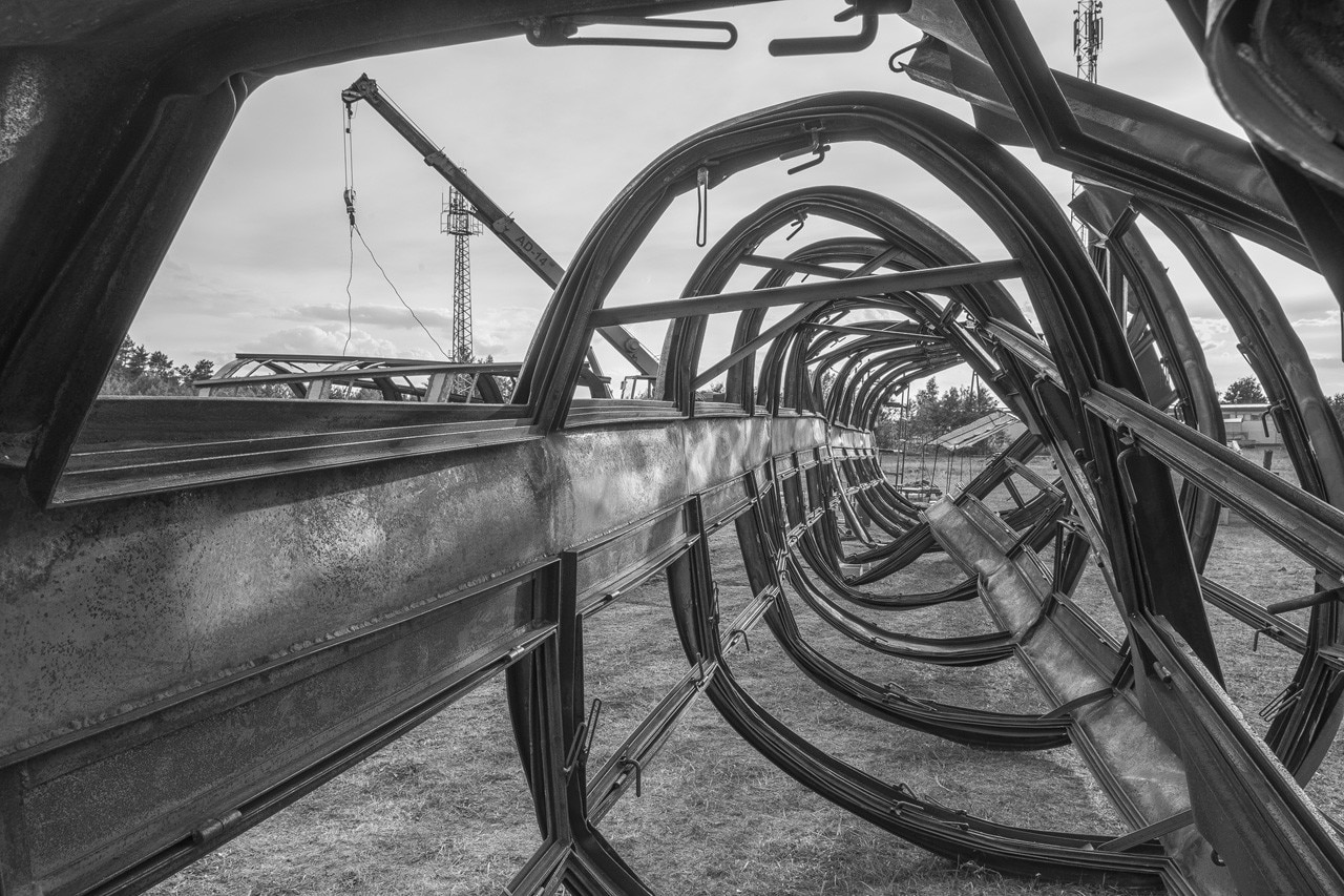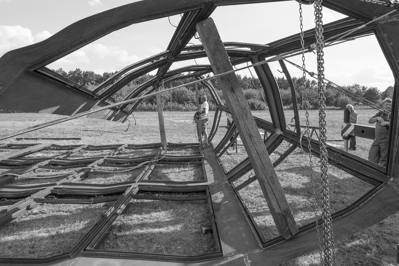Sotto le sue mani gli snelli pannelli d’acciaio brunito si curvano, si torcono e si piegano allungandosi in un carcassa orizzontale lunga quasi 34 metri saldata insieme, che conserva particolari originali come le maniglie delle finestre. L’opera è suddivisa in due sezioni: nella prima una singola parete continua si incurva dispiegandosi in una galleria cilindrica, collegata perpendicolarmente a tre altre pareti continue sovrapposte l’una all’altra in una forma cilindrica molto più aerea, attraverso la quale si può osservare l’interno della parte terminale della scultura