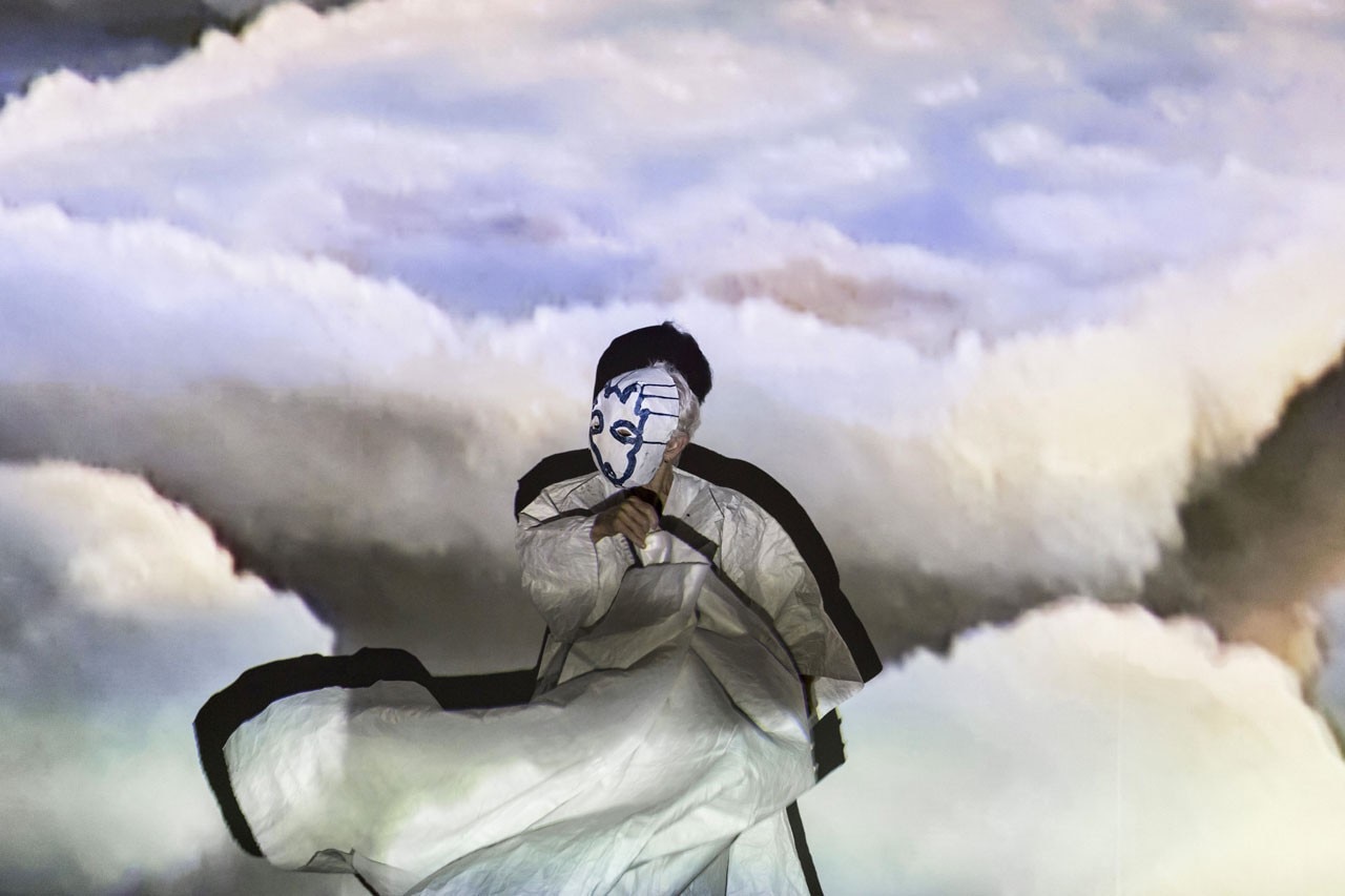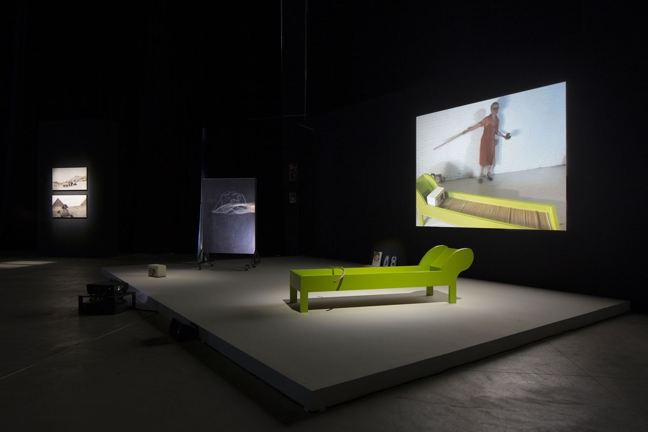 Il risultato è un decotto molto coinvolgente di miti, visioni, presenze, che oscura il cosiddetto mondo reale, tangibile, e lascia illuminato solo quello inconscio, pseudoimmaginario. Un’allucinazione a tinte forti, dove una chaise longue verde lime (rivisitazione del lettino dell’analista) invita a un viaggio nel dimenticato, nell’inosservato, nel paranormale. “Elena era una stella, una nave o un tempio?” “La guerra era inevitabile? Chi ha vinto? Chi ha perso?” Sfingi e spirali. Vesti viola, blu, nere, a quadri e a righe. Greggi di pecore e di montoni. Il melograno rovinato dall’inverno, il melograno in fiore. Il suono del gesso sulla lavagna. “Ho visto il mondo attraverso la mia doppia lente, sembrava che tutto si fosse rotto, tutto tranne quella”. La piramide di Cheope. La piramide di vetro del Luxor Hotel. Tutto gira, s’arresta, riprende a girare. Un battito di ciglia, e la sfinge è a gambe all’aria. E sul drappo di sabbia dorata di Lines in the Sand sembrano posarsi luccicanti fiocchi di neve.