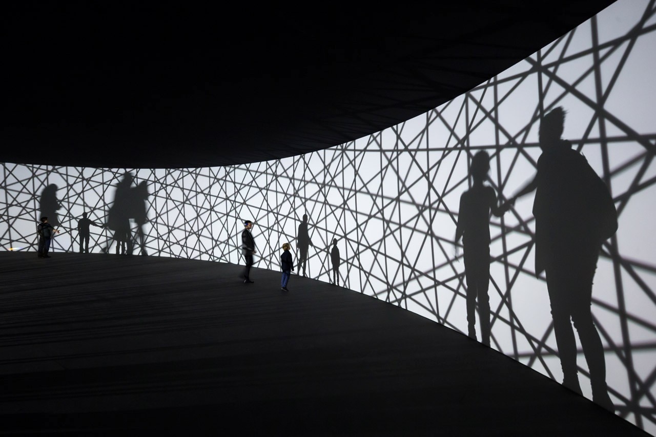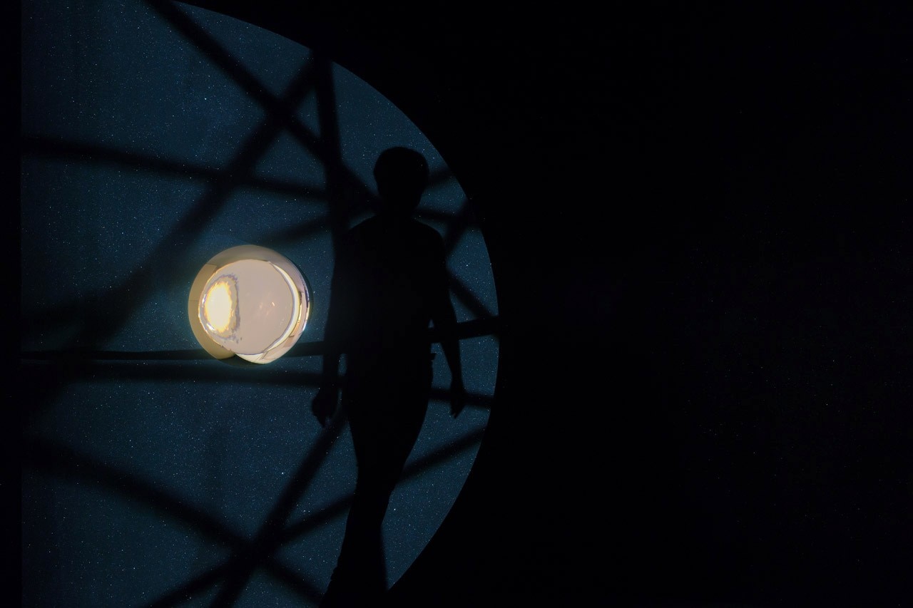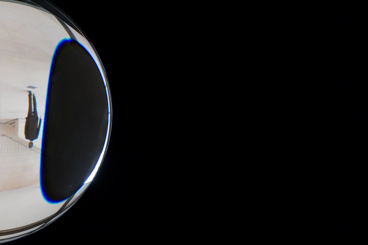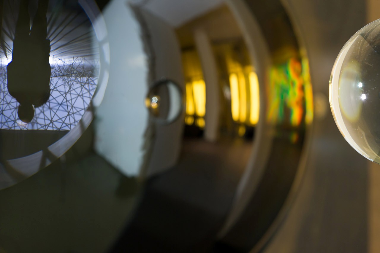 Lo spazio che ospita la mostra diviene dunque un reperto, stiamo già contemplando le rovine di questo museo, il bianco immacolato del cemento Ductal non è che una presenza fantasmatica. Lo vediamo di tanto in tanto riflesso nelle sfere che appaiono comunque come piani convessi. È la mappa reticolare dei pensieri non pensati “map for unthought thoughts” in cui la sfericità presunta dello spazio deambulabile si rivela essere un gioco di specchi e noi stessi diventiamo reticolo o meglio niente di più che ombre reticolari nell’interazione con lo spazio circostante. Quasi come figure di Giacometti proiettate in una immagine di fantascienza. Esitenzialismo cosmico, sottolineato dall’arrivo imprevisto su un suolo semisferico, percepito dai piedi come la calotta di un pianeta. È in corso un’eclisse rinforzata dal passaggio di una luce che taglia il nostro orizzonte esattamente come se un altro astro ci passasse davanti. Paradossalmente siamo passeggiando in uno spazio indefinibile. Eliasson ci fornisce un modello di spazio.
