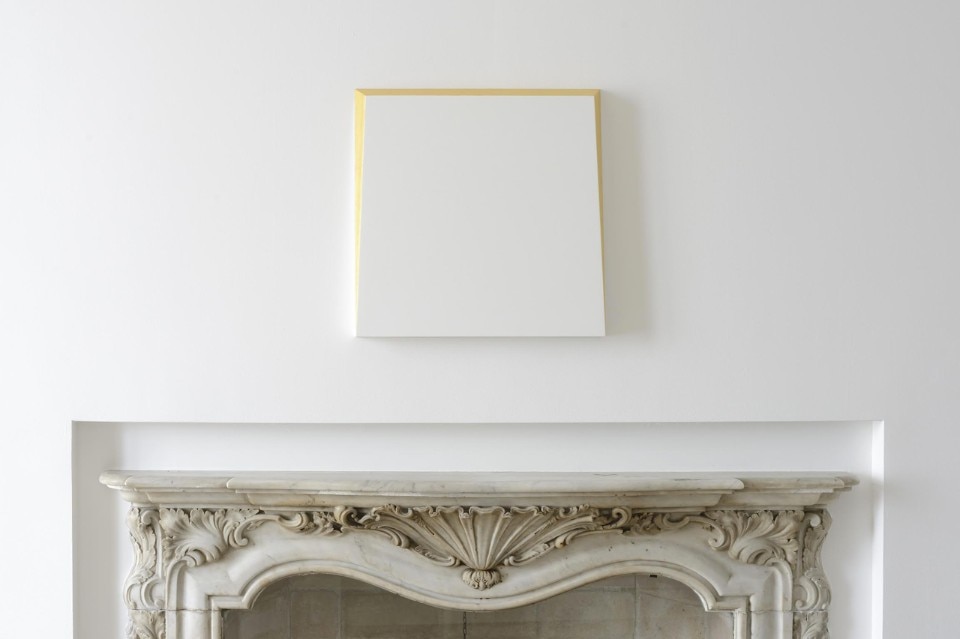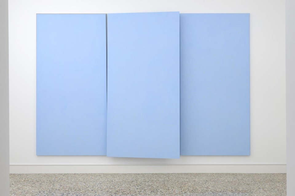 Qui l’azzurro e il rosa sono più sospetti cromatici che colori, quasi dei soffi, l’oro è luce abbagliante che mina la compiutezza semplice delle forme, spesso cancellandone gli angoli, mentre due superfici, celesti e celestiali, collocate su due diverse pareti, si attirano tra loro come calamite e si avvicinano fino a sfiorarsi in un angolo della stanza.