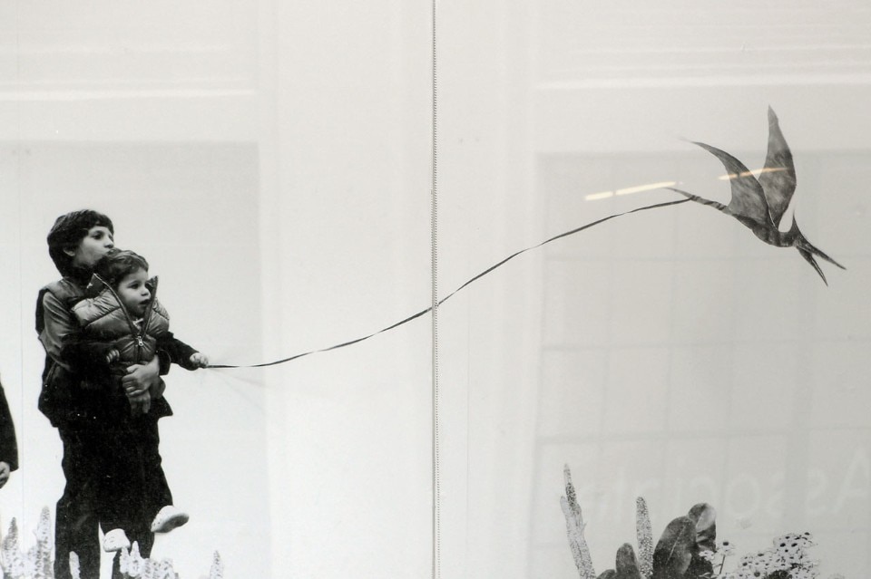 Andrea Mastrovito sta a tutti gli effetti disegnando usando il vento. Lo fa spostando e rispostando i ventilatori da una parte all’altra di quello stanzino, fino a dare all’aria prodotta l’equilibro giusto che imprime su quei personaggi stampati un movimento che ne suggerisca la disperazione fisica. Disperazione che appare evidente ad esempio nell’undicesimo collage, dove Mastrovito riprende la celebre statua del soldato di Creuilly che qui sembra perdere la sua oggettualità, sventolando frenetica nell’aria, trascinata via dalle bandiere dei tre paesi alleati: Francia, Inghilterra e USA.