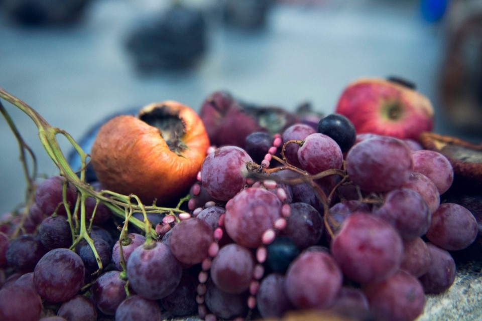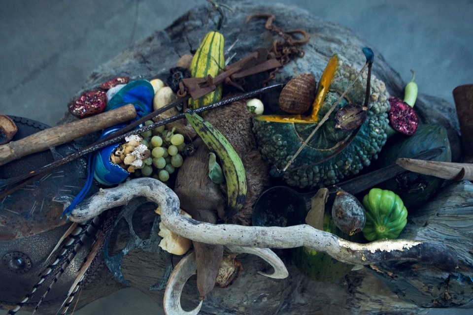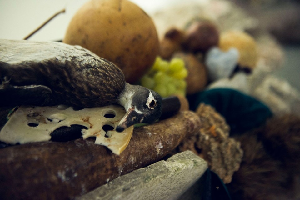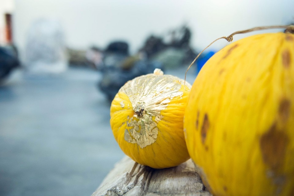 Si resta a guadarli con tonto stupore e occorre avvicinarsi molto prima di scoprire che, sopra ogni pietra, marmo o legno, alberga la carcassa di un animale da piuma, o un cespo di verza avvizzita, o una ciocca di alghe aggrovigliate, o un pomodoro marcito, o una spugna di mare, o un melone o una zucca guasti e putrescenti; come pure, adagiate su questi giacigli incontinenti – alcuni buttano schiuma e maleolenti liquami – stanno inservibili cianfrusaglie (comperate dall’artista al Balon di Torino, lo storico mercato dei cenci): una spilla di perle, un paio di corna di cervo, una scintillante caraffa smeraldina. Depositate come resti di un naufragio sugli scogli, queste fradice nature morte trasudano tutta la contingenza del proprio tempo. Un tempo consunto, smangiato, privato d’ogni grandezza.