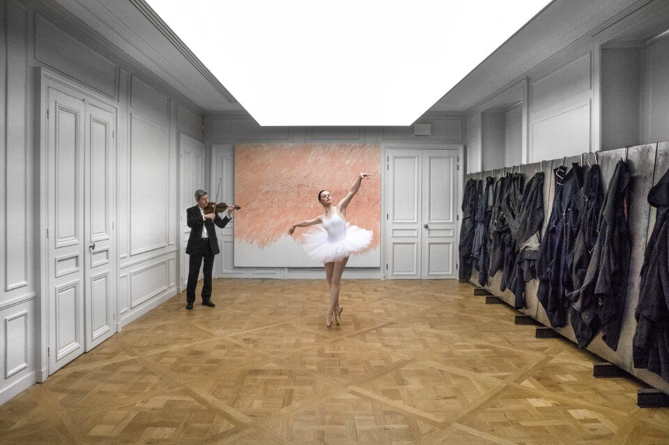 Ed ecco la magia di una installazione che sembra in alcune parti appena uscita da un Tiepolo. C’è tutta la drammaticità del Kounellis dei fuochi e delle lamiere ferite e arrotolate, ma anche la sua capacità nel ricreare la tensione di lavori sorprendenti come il Senza Titolo (Da Inventare sul Posto) del 1972. Presentato alla galleria Attico di Roma e poi riattivato nella Documenta 5 di Harald Szeemann. La tela con lo spartito dal Pulcinella di Stravinsky, e il suo rosa ‘twomblyano’ viene riproposta con l’esecuzione dal vivo di musicista e ballerina. Segnò nella carriera di Kounellis un distacco ancora più fermo dai materiali classici e, se ci si pensa, davvero anticipatorio. La stessa relazione dell’utilizzo di Petruscha da parte di Philippe Parreno, la si ritrova in anni a noi più vicini nella deriva materiale di cui si è nutrita tanta arte relazionale.