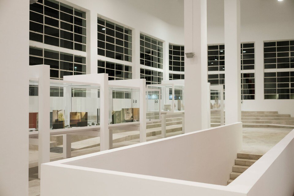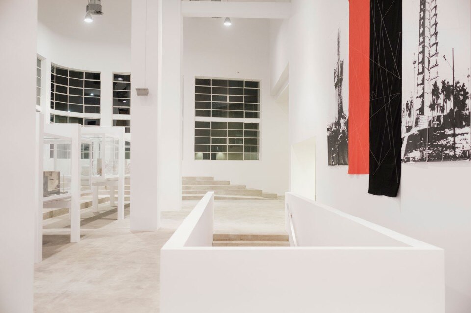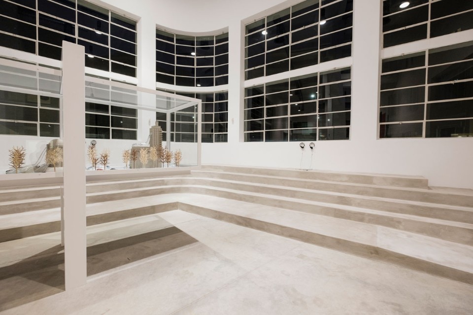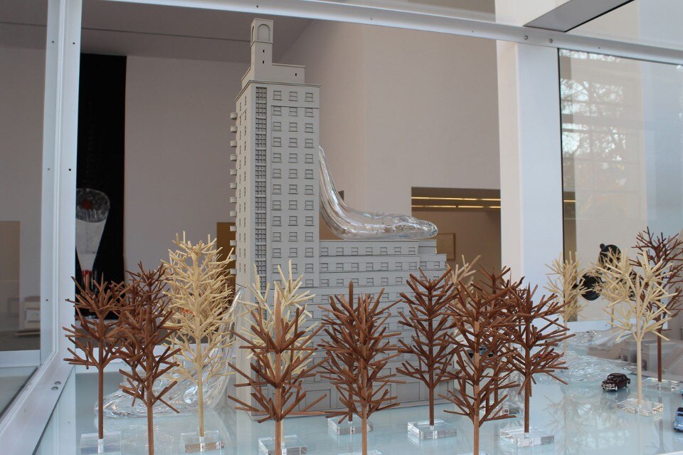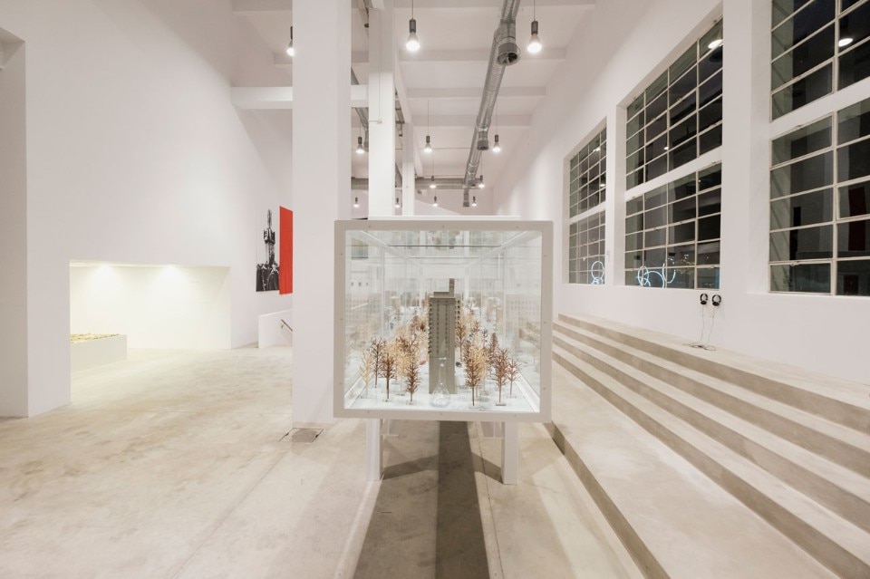 Come si diceva, tra il bianco della colomba della pace e il nero dell’aquila c’è una lunga zona grigia, un non-colore apparentemente neutro come quello che l’artista utilizza per la ricostruzione in scala degli edifici che troviamo nella seconda teca centrale, parte dell’opera che dà il titolo alla mostra: El Palacio de las Tres Historias. Racchiusi dentro un elegante volume che richiama le forme dello spazio che lo ospita, ci sono le ricostruzioni di architetture che hanno un legame con la storia politica del nostro Paese, in particolare con quello fascista. A inizio ottobre il New Yorker ha pubblicato un dibattuto articolo di Ruth Ben Ghiat a proposito dei simboli fascisti tutt’ora conservati in Italia e come è riemerso in questa occasione, la riflessione in proposito è molto complessa e non può risolversi all’interno della logica buoni-cattivi. Lo dimostrano bene gli edifici che Garaicoa mette in bacheca: il Sacrario militare di Oslavia, la Torre di Maratona dello stadio di Torino, il palazzo della Civiltà Italiana di Roma, la Casa del Fascio di Como, la panoptica urbana del Villaggio operaio SNAI di Torino, un progetto (non realizzato) per i caduti sul Monte Grappa e la Torre Littoria torinese. Allineati all’interno di un unico grande plastico, uniformati attraverso la privazione di colori e materiali caratteristici e riambientati in una sorta di raffinatissimo acquario surreale, questi edifici da cui fuoriescono molli bolle di vetro alla Dalì, si prestano così a raccontare un’altra storia, forse ancora da scrivere.