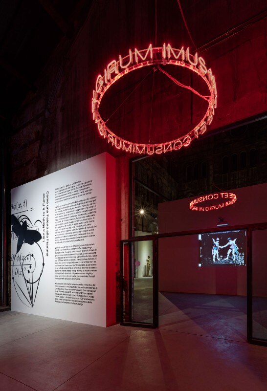 D’altra parte, è proprio il collezionismo il tema che dipana i fili dell’ambiziosa mostra torinese in cui c’è di tutto e il suo contrario. “I curatori hanno costruito un puzzle di artisti in un progetto che ragiona sull’esercizio stesso del collezionare” spiega Nicola Ricciardi, direttore artistico di OGR. “Ecco allora la serialità, l’accumulo, il desiderio di sopravvivere a se stessi. Come già ai tempi dell’antico Egitto, quando il faraone veniva tumulato con tutto un apparato materiale che doveva testimoniare chi era stato in vita”. Il titolo è la prima traccia che instrada verso la lettura della mostra e risponde all’indovinello in forma di frase palindroma che pende scolpita nel neon di Ceryth Win Evans appeso sulla soglia: “In girum imus nocte et consumimur igni”. Cosa va in giro di notte ed è consumato dalle fiamme? Per i curatori il collezionista è proprio come la farfalla notturna che si affanna con sbatter d’ali compulsivo attorno alla fonte di luce. Quella di Evans è a sua volta una citazione dell’ultimo film di Guy Debord, padre fondatore del Situazionismo, video che apre la rassegna da Sandretto. Situazionismo che torna alle OGR, nel ciclo di dipinti dell’albese Pinot Gallizio. È tutt’un inseguirsi di rimandi che i curatori disseminano in mostra costruendo un viaggio virtuale per la città di Torino e attraverso i secoli.