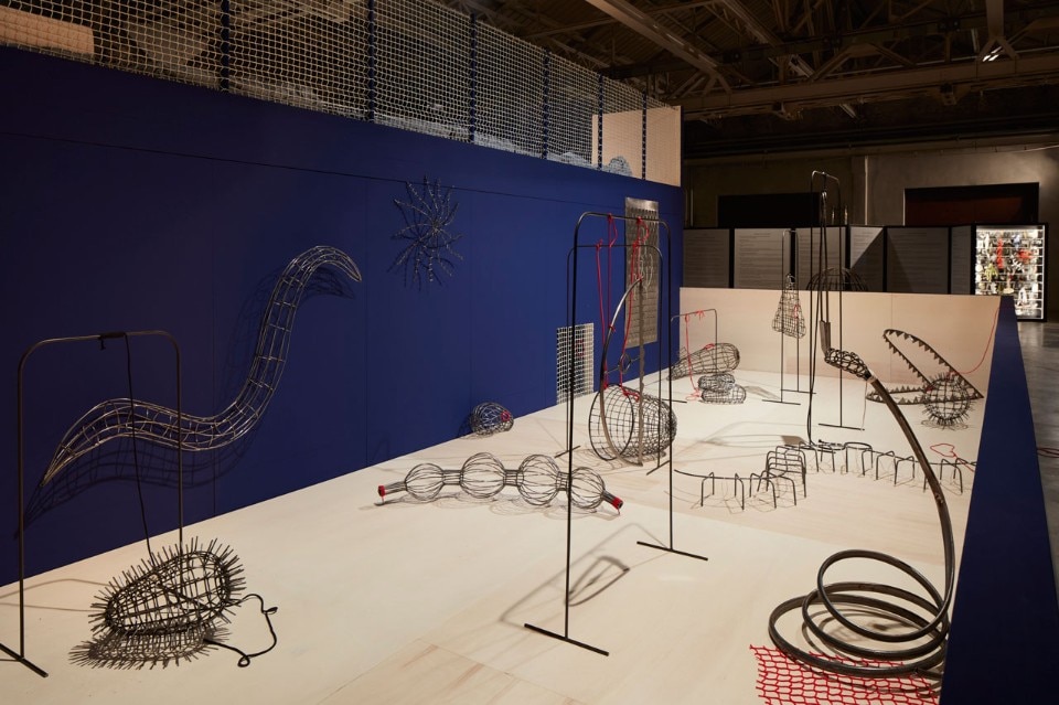 Varcare la soglia tra il dentro e il fuori qui non è un’esperienza traumatica: veniamo invitati a percorrere il tunnel-esofago blu, sostare nello stomaco in qualità di spettatori di una prima opera video (in cui un gruppo di bambini si sottopone a una serie di esercizi già velati da un alone d’inquietudine), per poi re-infilarci nel tunnel-intestino fino a sbucare nel sovraffollato mondo messo in scena dall’artista.