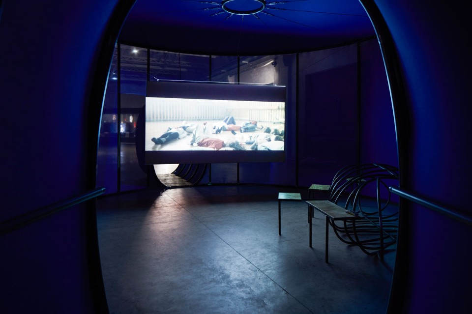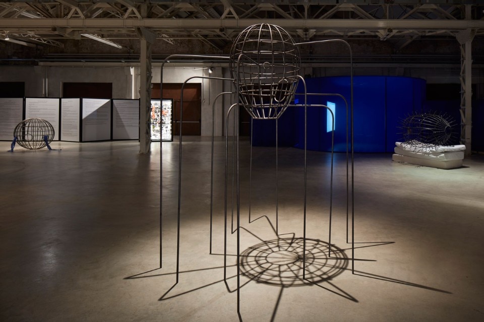 Passando poi da una riflessione storiografica a una dimensione più strettamente esperienziale, incontriamo (in realtà a fine percorso) un lavoro che in alcuni momenti viene attivato da un attore che invita il visitatore a salire sulla pedana per farsi tagliare i capelli e che tenendo tra le mani lunghe forbici racconta storie di cronaca, tra una spuntata e l’altra, risvegliando nell’avventore (in modo molto controllato) anche una latente preoccupazione per la propria incolumità. L’opera centrale, realizzata per questa occasione e che dà il titolo alla mostra però è The Dream Machine is Asleep, un sovradimensionato letto con cassettone che pare essere l’unica isola di libertà all’interno di questo marasma di coercizioni e controllo. Solo qui tutte le gabbie che ci siamo costruiti attorno sembrano svanire.