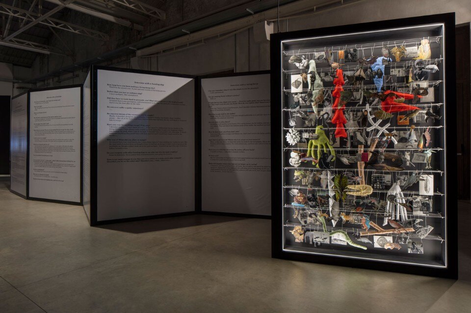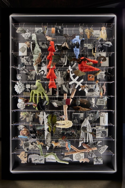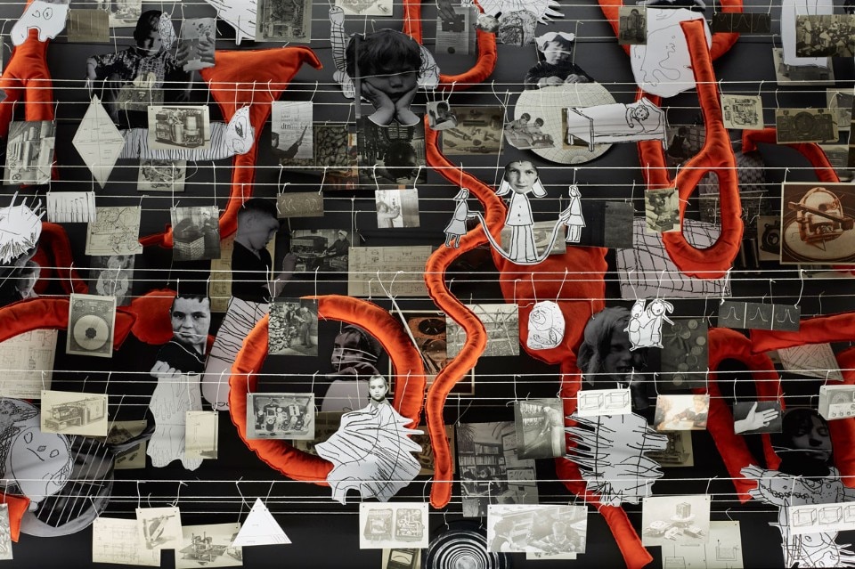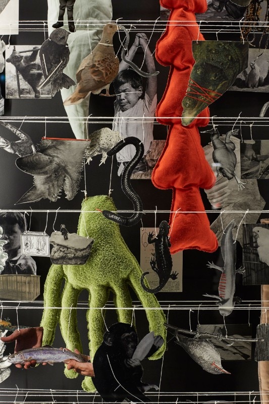 Durante questo percorso iniziatico, lasciamo indietro le immagini del fuori e ci predisponiamo alla ricezione del dentro. Una volta fuori dal tunnel, superato un primo brevissimo istante di disorientamento – dato forse anche da un allestimento che non sembra indicarci una via da seguire – quello che percepiamo è proprio questa “semi-cosa” che è l’atmosfera che sta tra noi e le opere e che, come spiega Griffero, viene irradiata dall’insieme inizialmente indefinito di ambiente e oggetti. Quella che aleggia in questa mostra è un’atmosfera cupa in cui la sensazione di angoscia viene confermata e amplificata ogni volta che si mette a fuoco una singola opera, avvicinandosi e scoprendo, per esempio, che le figure di bambini ritagliate e inserite nei Diary (libri dal formato ingigantito in cui vengono affastellate immagini ritagliate) hanno quasi sempre occhi o bocca chiusi da un filo di spago. Nel Diary no.1 (I-Animal) si trovano le interviste immaginarie fatte dall’artista ad animali costretti a vivere contro la loro natura, secondo dettami imposti dall’uomo.