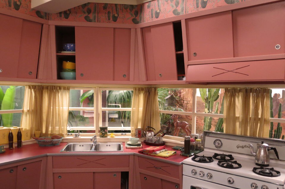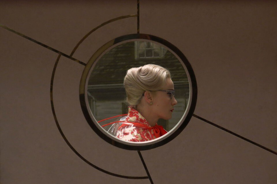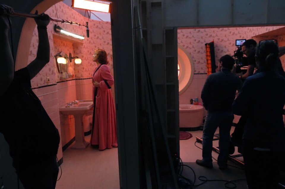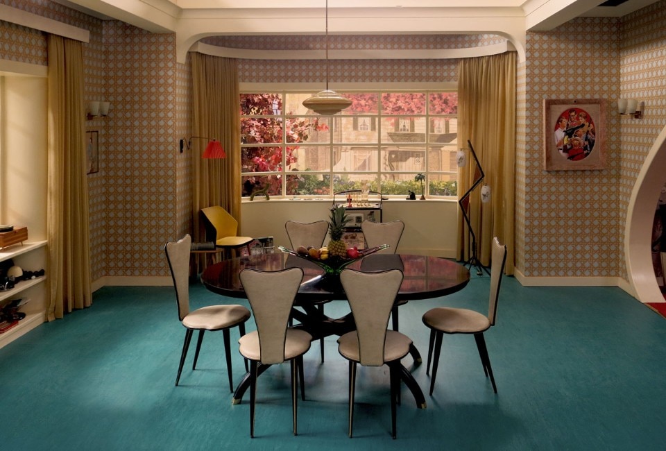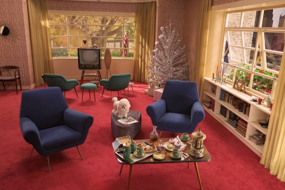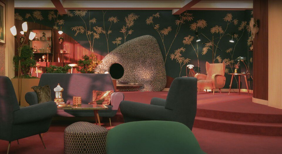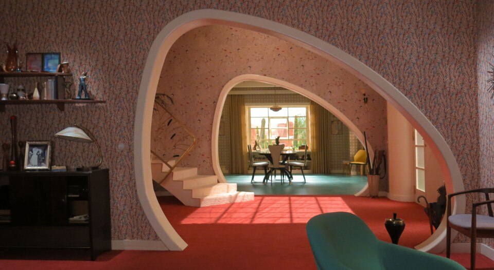 L’ampia casa di Mrs Fairytale, ricostruita in studio come nei film della Hollywood degli anni d’oro con Doris Day, riferimento imprescindibile, ma anche di Alfred Hitchcock (Mrs Emerald biondissima e in apparenza algida come le sue eroine), è un tripudio di colori vivaci e forme anni Cinquanta in cui non mancano moquette rossa, carte da parati con fantasie sgargianti come fenicotteri rosa su fondo blu e boiserie. Gli spazi della casa comunicano attraverso aperture dai contorni ogivali che, ripresi in infilata, creano un vertiginoso tunnel come a sottolineare che anche il quel mondo apparentemente perfetto, da favola appunto, si nasconde l’incubo.
