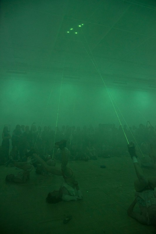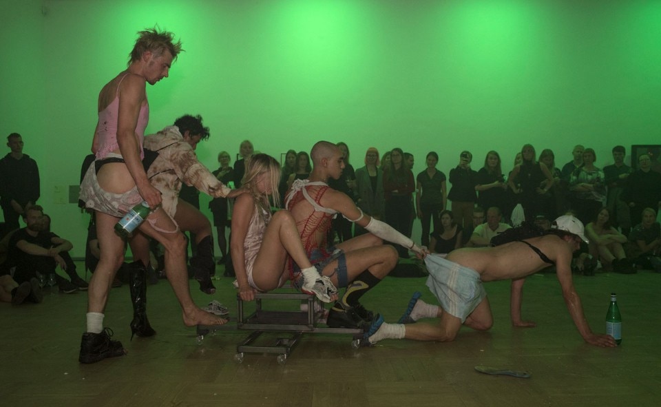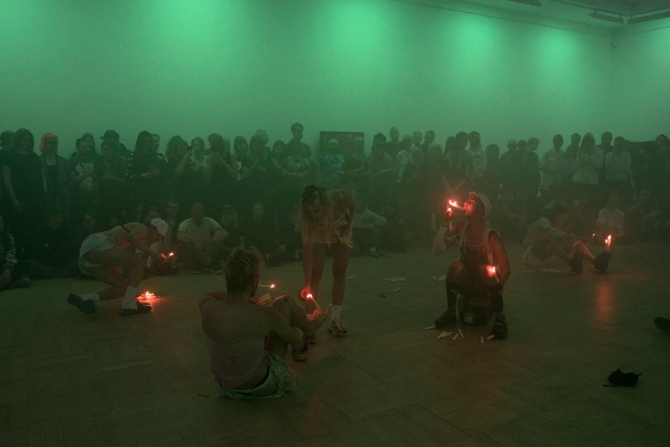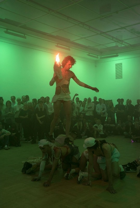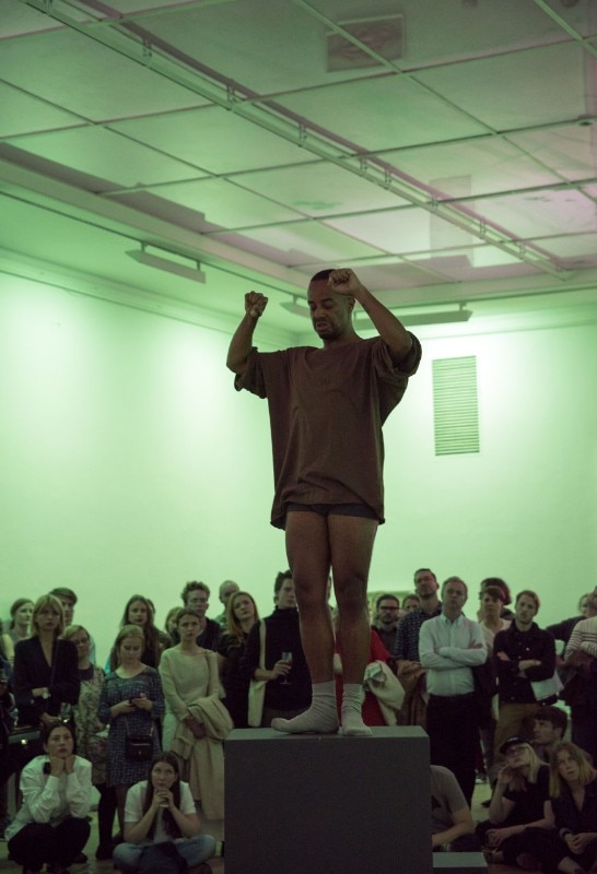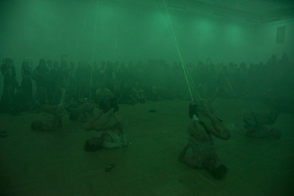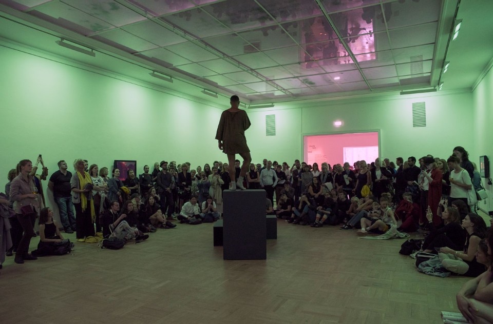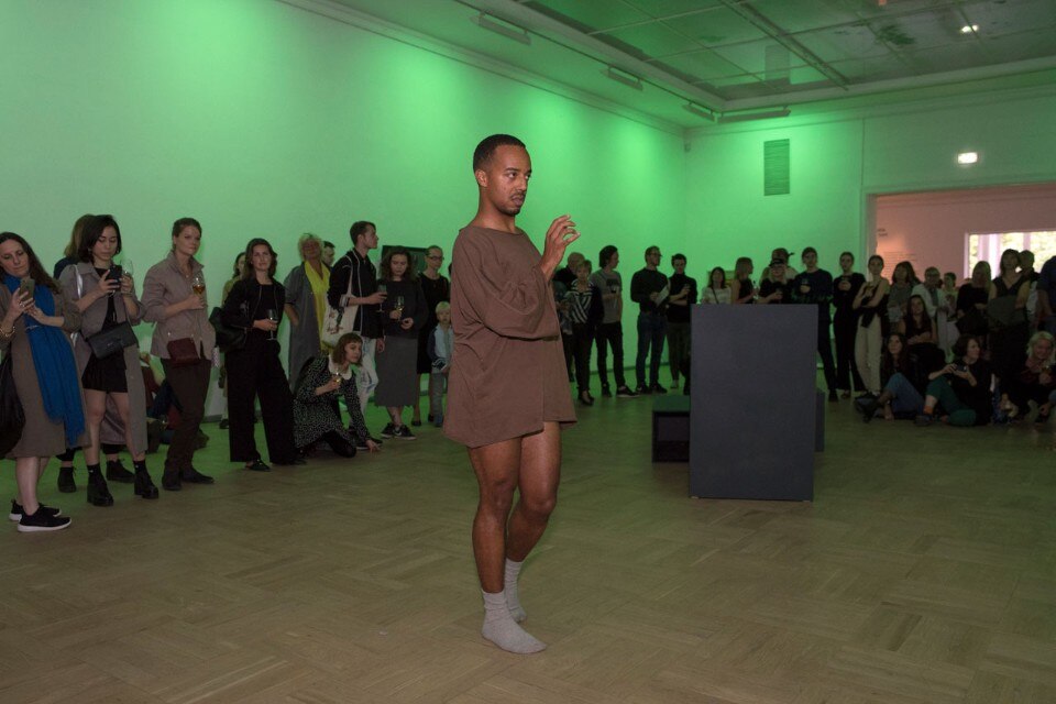 Il giorno dell’inaugurazione, la performance di Estna – un tableau vivant con nudo maschile – ha preceduto una danza stregata di Paul Maheke che lascia il passo ai salti tonali della voce di Adam Christensen. Il canto di Christensen ci porta verso l’opacità del nostro intimo. L’apparente trasparenza delle categorie linguistiche si contrappone alla frammentata fragilità del corpo e di chi lo abita. Il profumo delle Young Girl Reading Group (silenziosamente indossato da corpi anonimi) e le danze anali degli Young Boy Dancing Group chiudono la serata con una violenta e scomposta seduzione.