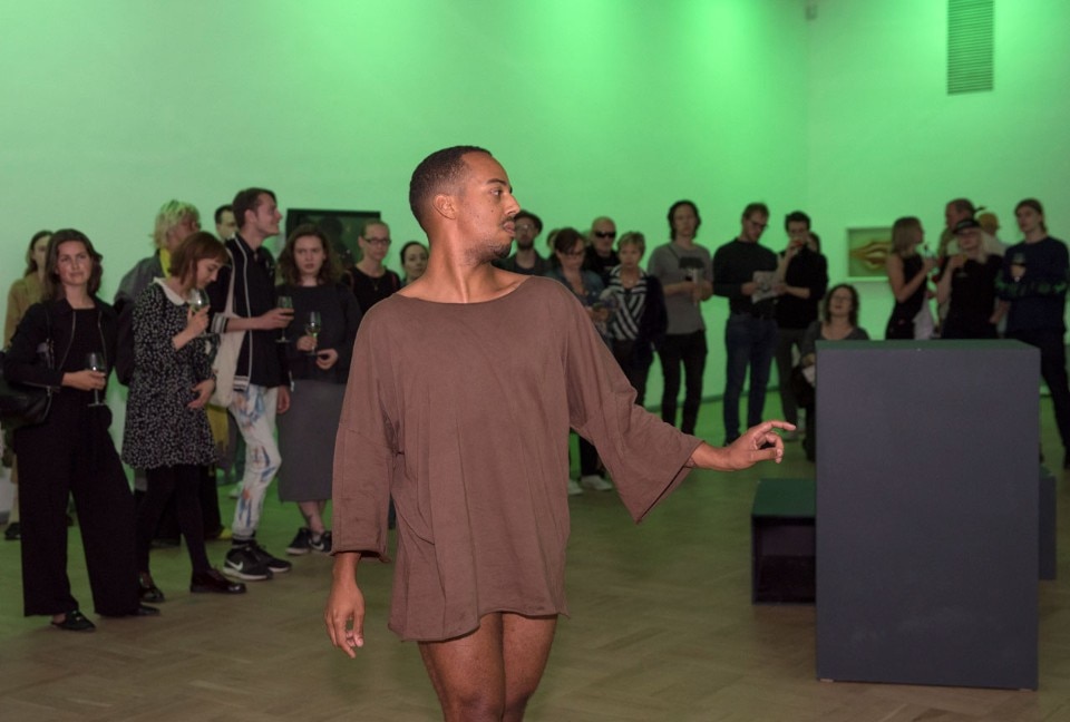 All’entrata della sede espositiva, l’oralità e l’ascolto sono il primo passo verso la decostruzione del linguaggio verbale personificata da voci di poeti, musicisti e coreografi raggruppate da Lina Lapelyté (artista che rappresenterà la Lituania alla Biennale di Venezia del 2019). Le orecchie ascoltano un collage di voci che ben traduce l’idea di un’identità polifonica, portando il visitatore al primo piano della sede espositiva. Qui si calpesta un lavoro di Merike Estna composto da un grande dipinto che estende la sua superficie visiva e tattile su un mosaico di mattonelle in ceramica, raffiguranti onde tortuose di serpenti. Proseguendo il cammino entriamo in una stanza invasa da una luce verde. Sul soffitto sono presenti alcuni versi poetici e sulla parete di fondo un tendaggio trasparente separa il visitatore da immagini del mare e dell’acqua. Si tratta del lavoro di Paul Maheke che avvolge completamente lo spazio, trasformandolo. Anche le altre opere presenti nella sala sono immerse in questa trasformazione e le foto in bianco e nero di Pierre Molinier o i frammenti di corpo ritratti da Ülo Sooster possono essere illuminati da alcune torce fornite ai visitatori. Lo spettatore diventa un esploratore della sensualità che si dipana tra le virtuose linee del corpo eroticizzato nei suoi intimi dettagli. Vivono invece di luce propria due video di Klara Lidén, in cui l’artista mette in discussione il corpo nello spazio urbano.