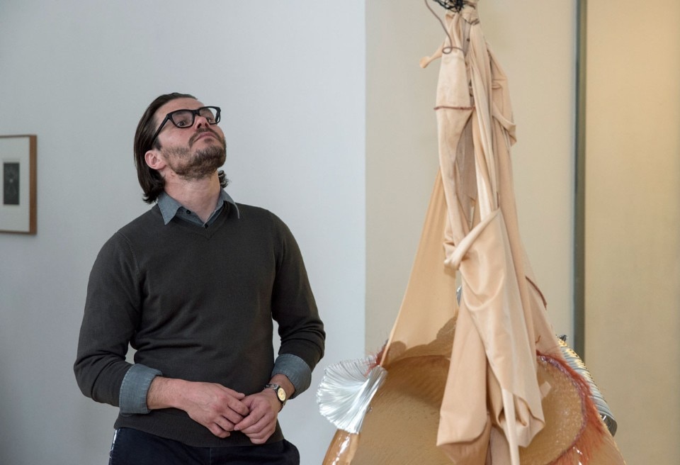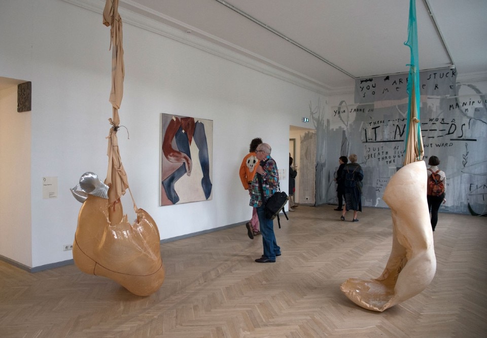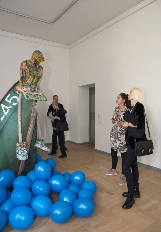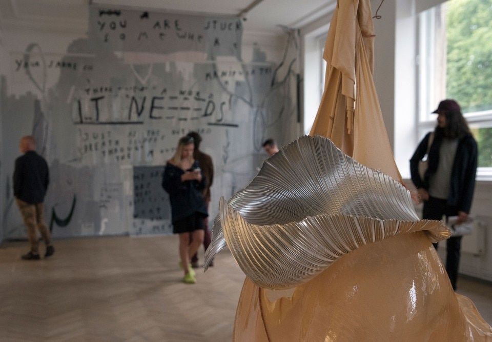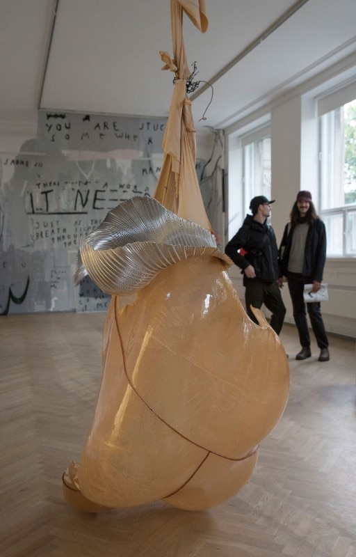 Un intervento di Ola Vasiljeva sulla vetrata circoscrive il confine tra esterno e interno. In questa sala ci accoglie una grande scultura di Kris Lemsalu (artista che rappresenterà l’Estonia alla prossima Biennale di Venezia). Una spettrale presenza fanciullesca – composta da un hoodie e due grandi sneaker in ceramica – infesta l’ambiente circostante dall’alto di un tronco di una nave che affonda nel blu di alcuni palloncini.