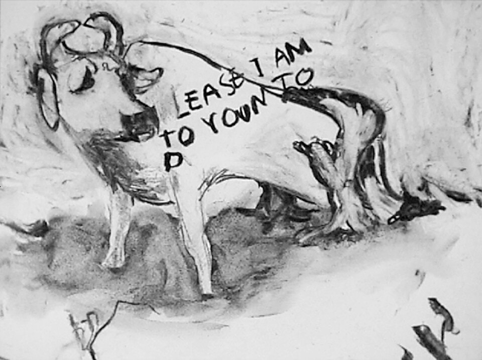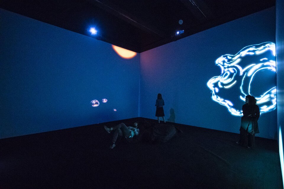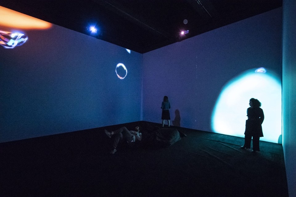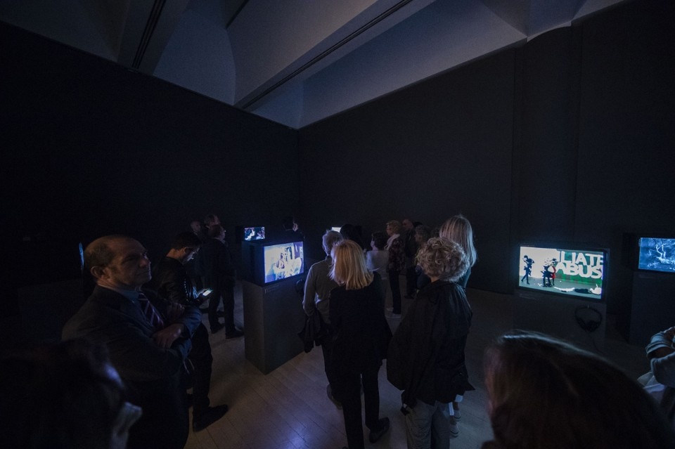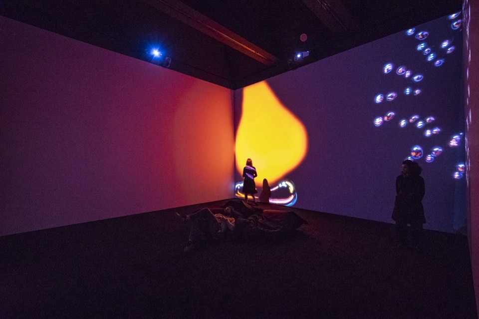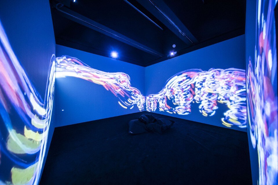 Il nostro affannarci tra disturbanti video che hanno come protagonisti infanti in lacrime in attesa di un aiuto che non arriverà mai, donne-drago disperate, esseri bestiali frustrati e soli, corridoi dalle porte infinite che si aprono su altri corridoi identici, come nel peggiore dei labirinti, preziosi oggetti fallici, topi, gatti e uccelli seduti attorno a tavole imbandite e imbrattate dalla loro stessa bestialità, conosce solo due pause: a metà strada in una stanza nella quale lasciarsi andare al suono contemplando le forme flessuose e astratte che ci fluttuano attorno e alla fine con un’opera interattiva nella quale attraverso la realtà virtuale finiamo a casa di un lupo in una foresta per poi uscire solo passando per le origini, nostre e delle nostre ossessioni.