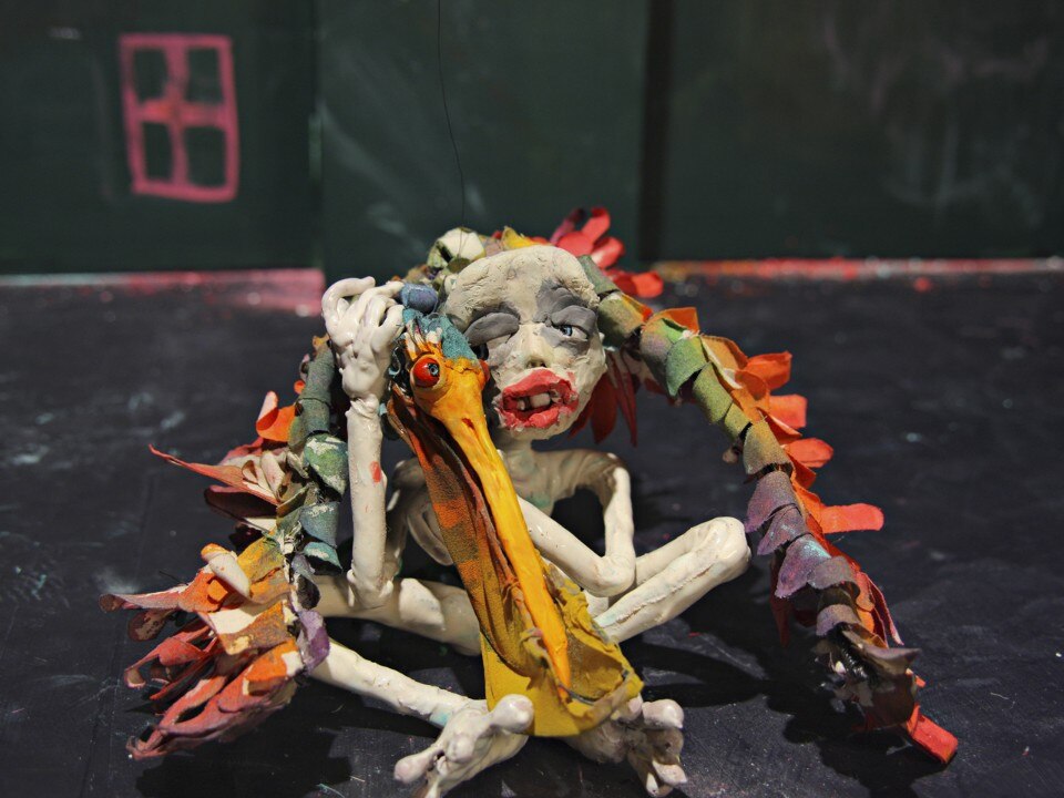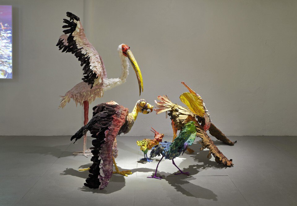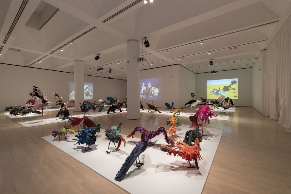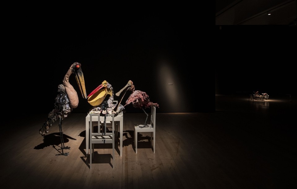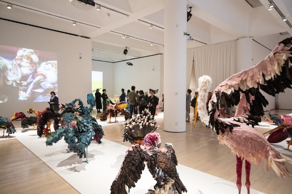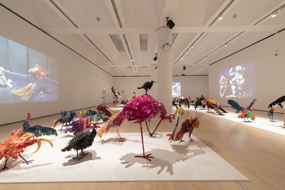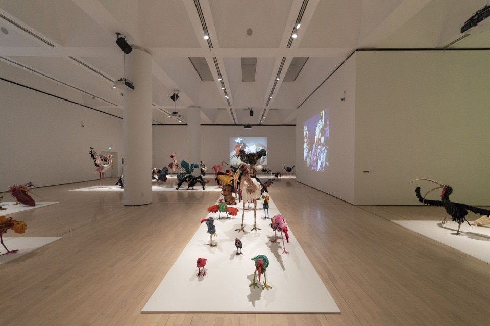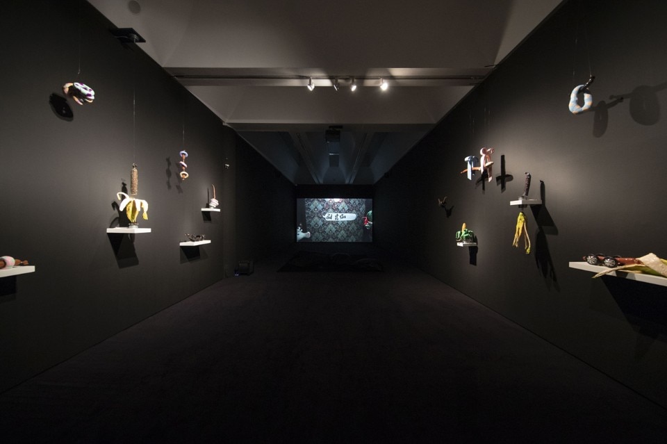 Varcata la soglia, però, l’impatto visivo è quello di un mondo sgargiante, coloratissimo e apparentemente allegro che fa scordare per un istante (solo uno) il messaggio di benvenuto rivolto al lato più oscuro di noi. Ma abbandonato lo sguardo d’insieme gli occhi iniziano a soffermarsi sui dettagli delle sculture, sulle proiezioni, le orecchie captano il suono che pian piano ipnotizza il corpo e s’intuisce che quel versante occulto è già in azione: sulle pareti scorrono sangue e violenza, manie di possesso e corpi dalle fattezze grottesche, mentre la stanza è gremita di uccelli che ad un’analisi più accurata appaiono quasi mostruosi, tutti elementi che ricompaiono con varie declinazioni da qui fino alla fine del percorso espositivo.