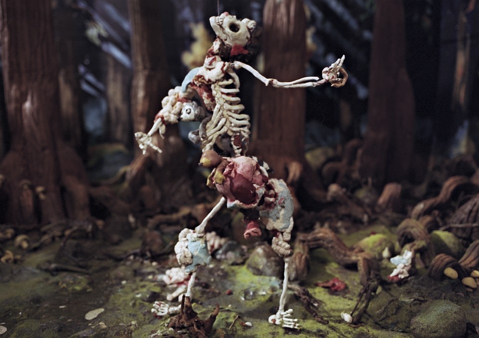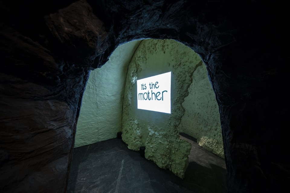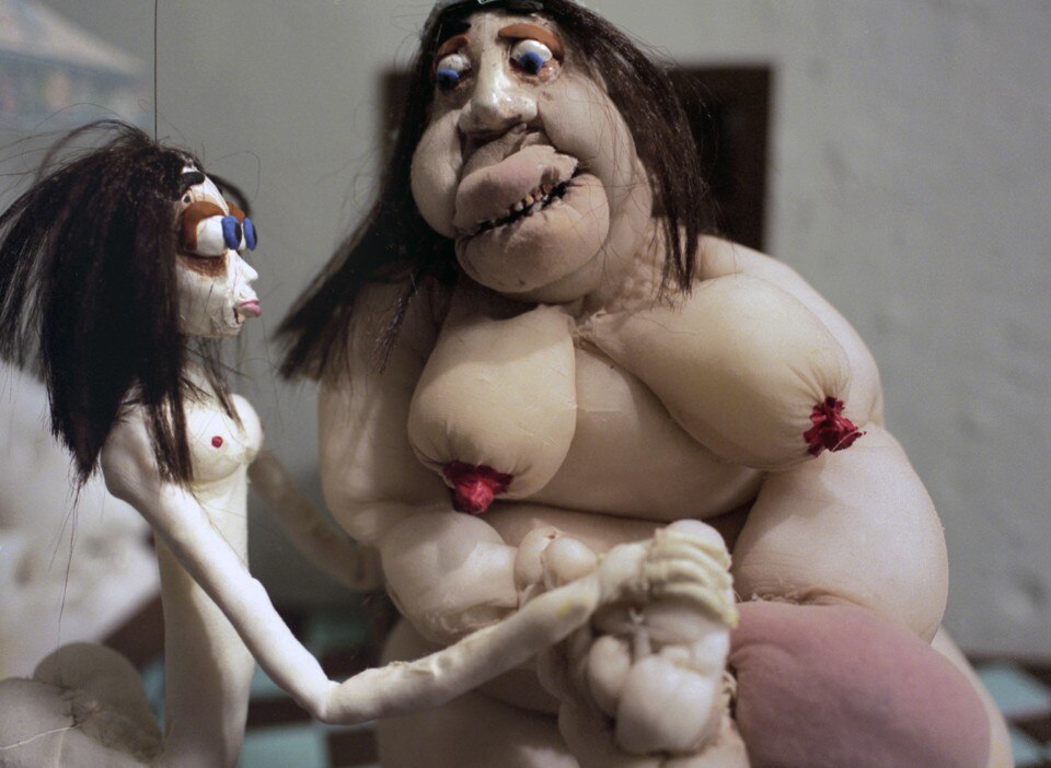 Dalla seconda sala ci s’inizia a inoltrare nel buio da cui sono circondati i monitor che presentano le prime opere della Djurberg che a quel tempo iniziava la sua collaborazione con Berg solo ad animazione terminata. Da qui in poi le tenebre non faranno altro che amplificare la brillantezza dei colori, che sembrano continuare a gridare felicità nel bel mezzo di un festival degli orrori. La sinfonia di corpi malfatti, occhi strabuzzati, scheletri, vermi, abusi, sopravvivenza, zoofilia e perversioni di varia natura prosegue per tutta la mostra. Il campionario degl’incubi umani non poteva certo non entrare nel profondissimo territorio delle relazioni madre-figlio, così dentro a una gigantesca patata (The Potato, appunto) si assiste al dramma di una madre i cui figli rientrano dentro di lei o a quello di una figlia schiacciata dal peso (reale) della propria madre obesa e malata.