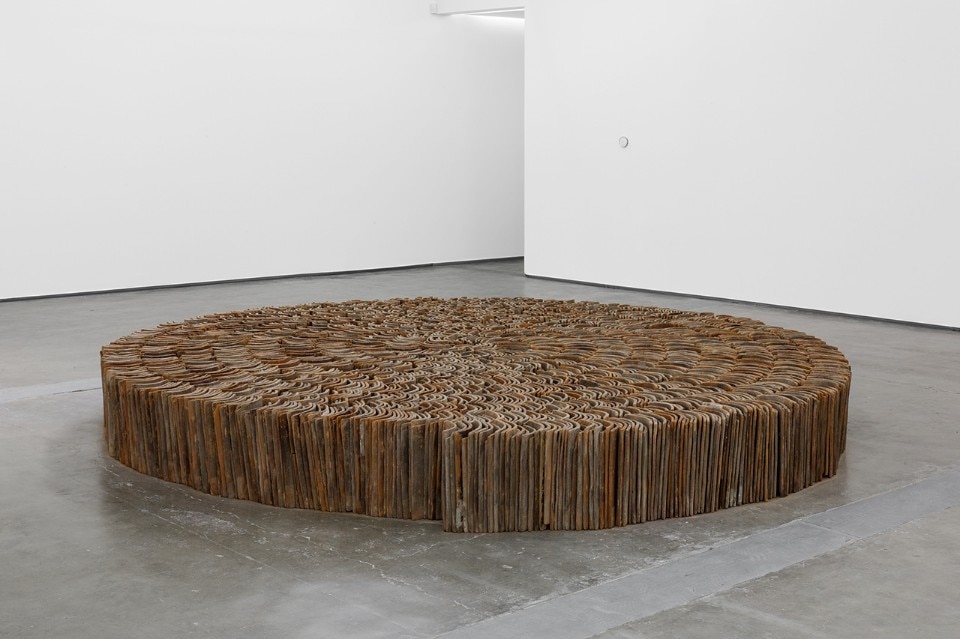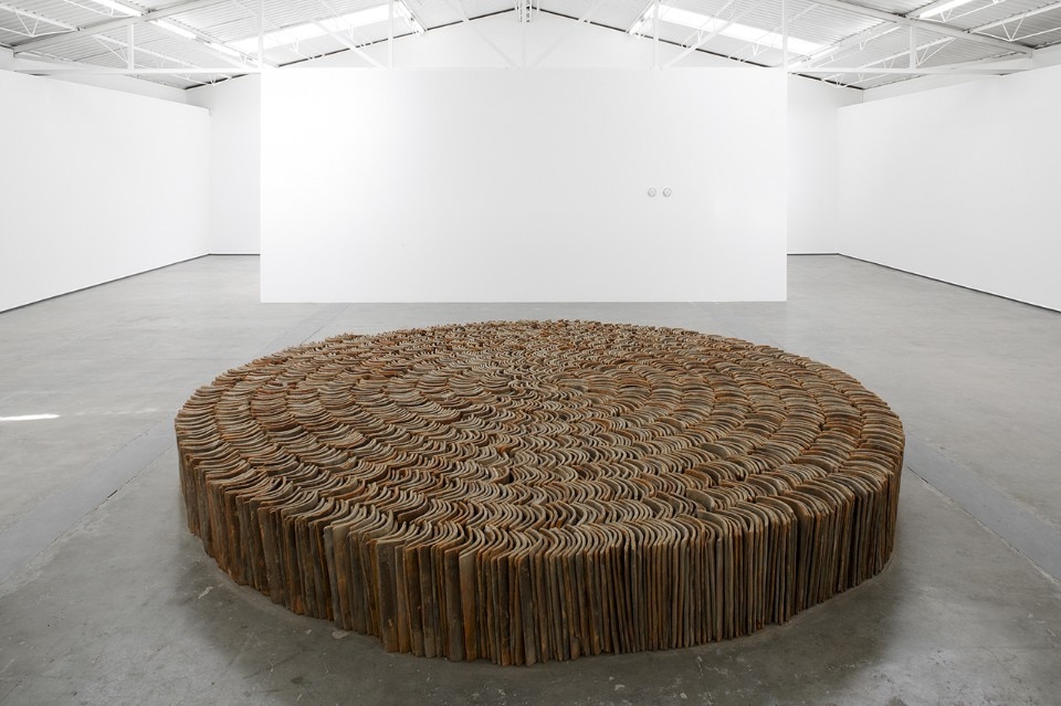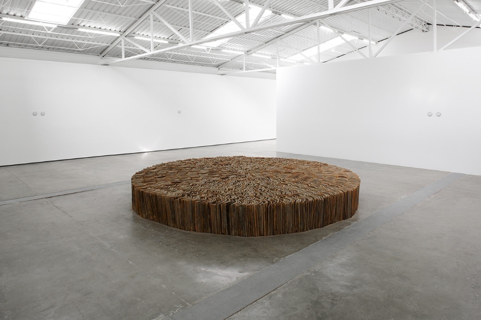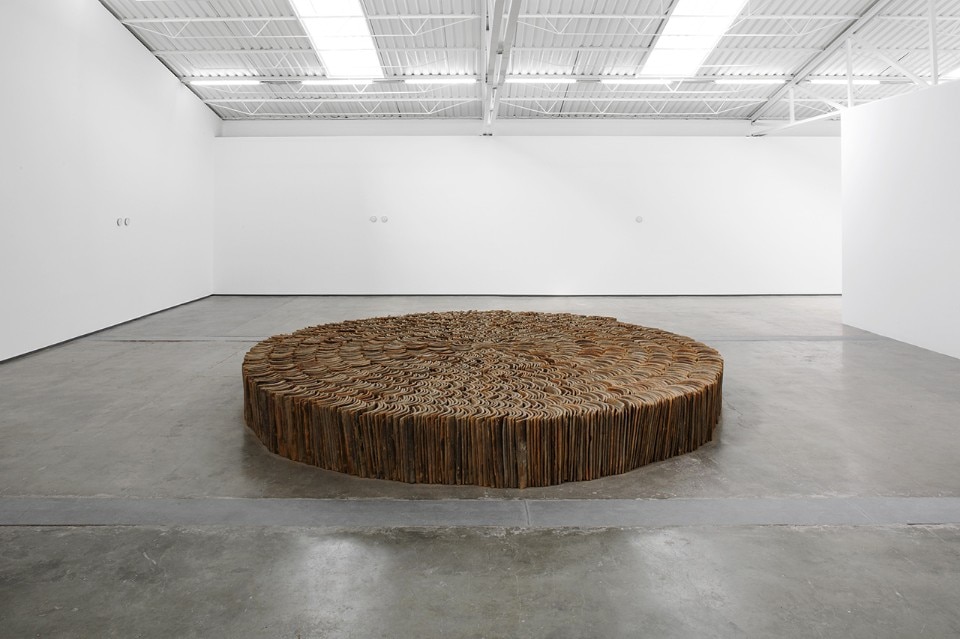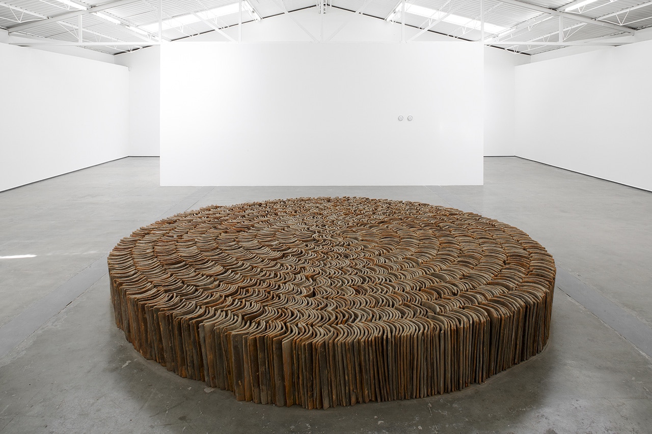 La principale scultura in mostra, El espesor del tiempo [“Lo spessore del tempo”] è una scultura circolare da pavimento del diametro di quattro metri, fittamente compattata in spirali ipnotiche, fatta di circa 3.200 tegole d’argilla provenienti dalla città messicana di Puebla.