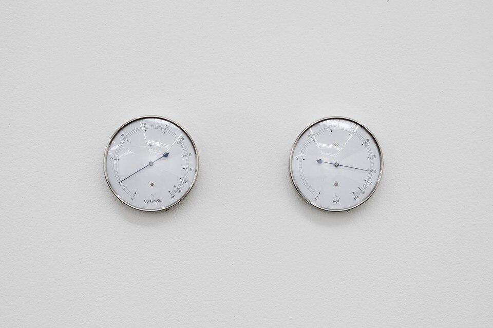 Ricorrendo alla linguistica viene consentita al pubblico un’interpretazione soggettiva. Más o Menos [“Più o meno”] è un installazione che presenta 12 igrometri modificati, ciascuno dei quali reca il nome di un’emozione: speranza, confusione, ansia, fiducia… Lo scambio tra misura dell’umidità e categorizzazione delle funzioni e dei processi mentali può essere interpretato come una specie di oscillazione dell’umore, che lega le fluttuazioni della personalità al cambiamento meteorologico.