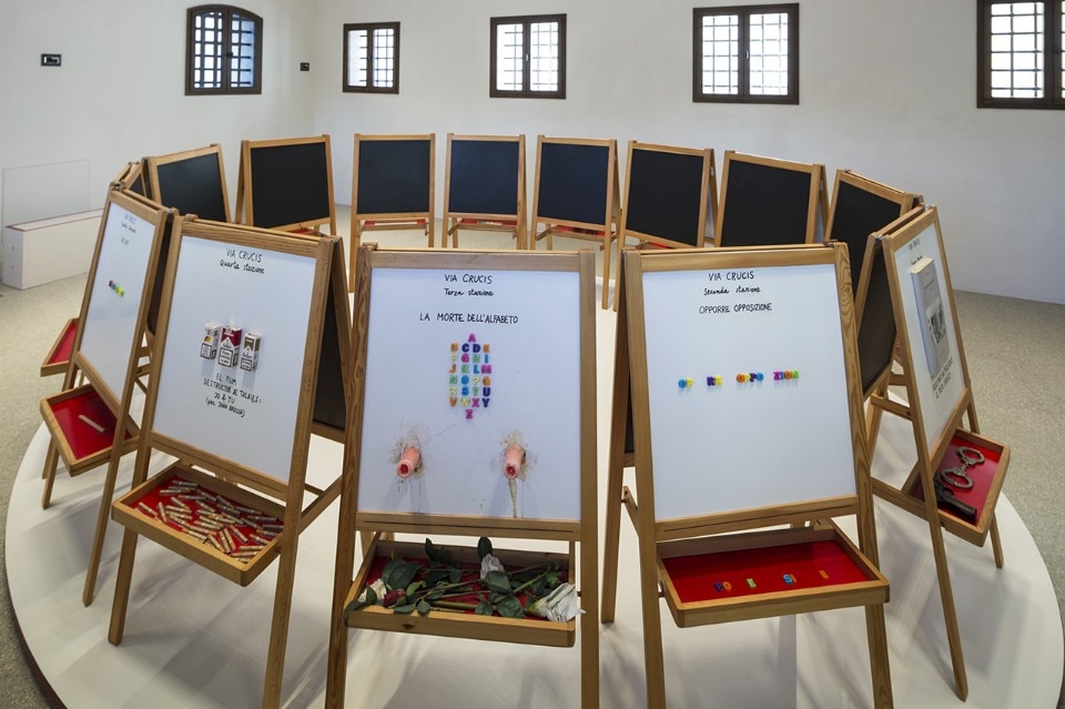 Le Gallerie delle Prigioni trovano sede nelle ex carceri asburgiche di Treviso. Posizionare quest’opera all’ingresso era per noi un segnale chiaro sia per il riferimento ai portali dei lager nazisti, sia per il fatto che si entrasse in una prigione attiva sino al Secondo dopoguerra. Con quest’invettiva, “la poesia rende liberi”, tipica del linguaggio caustico e ironico di Sarenco, l’artista sovverte il messaggio e provocatoriamente sostituisce Arbeit (“lavoro”), con Gedicht (“poesia”), suggerendo a tutti coloro che varcano il portale ed entrano a vedere la mostra che la qualità della vita è fatta, anche, dal tempo dedicato all’arte e alla poesia.