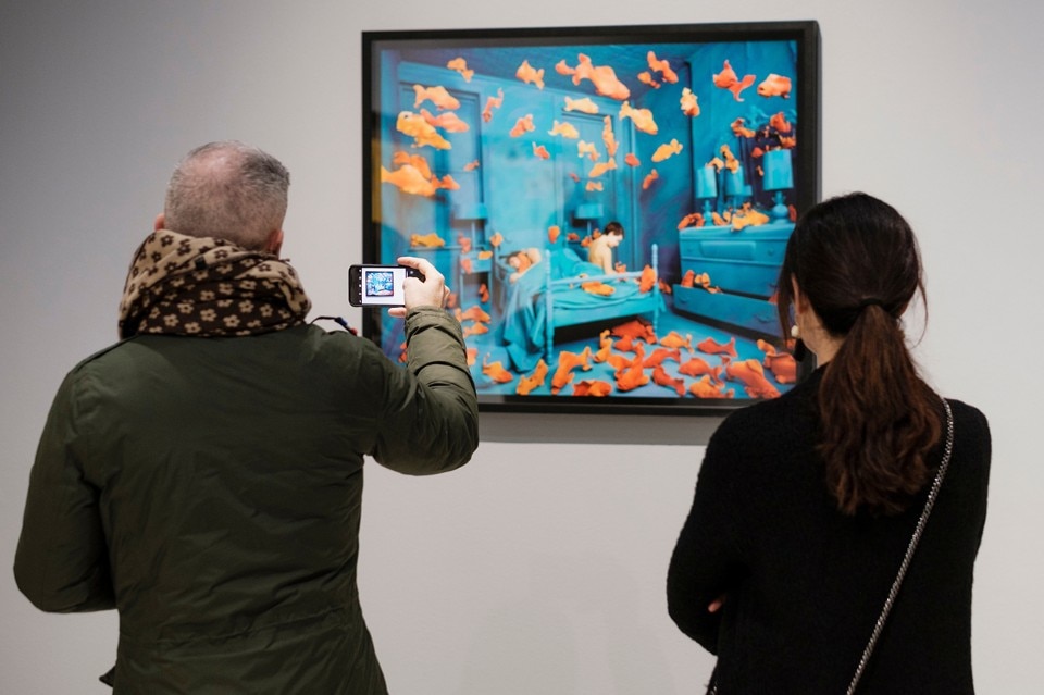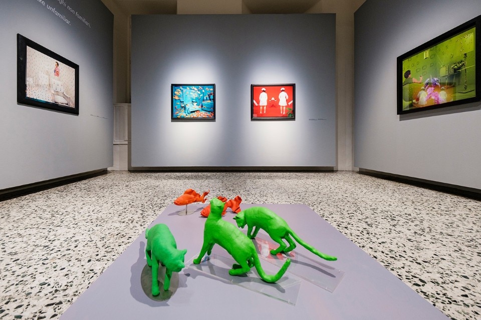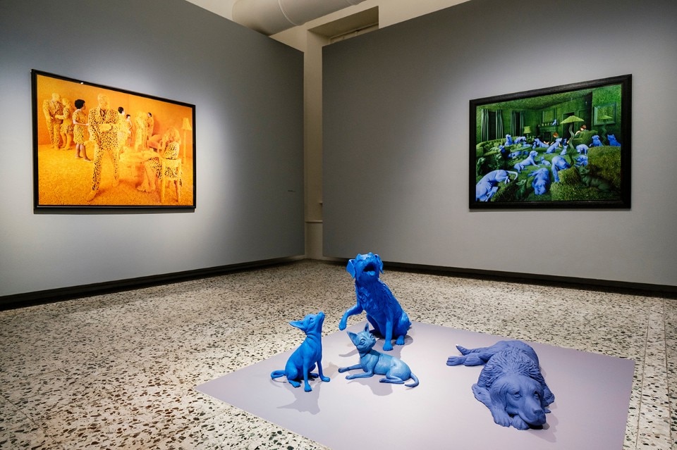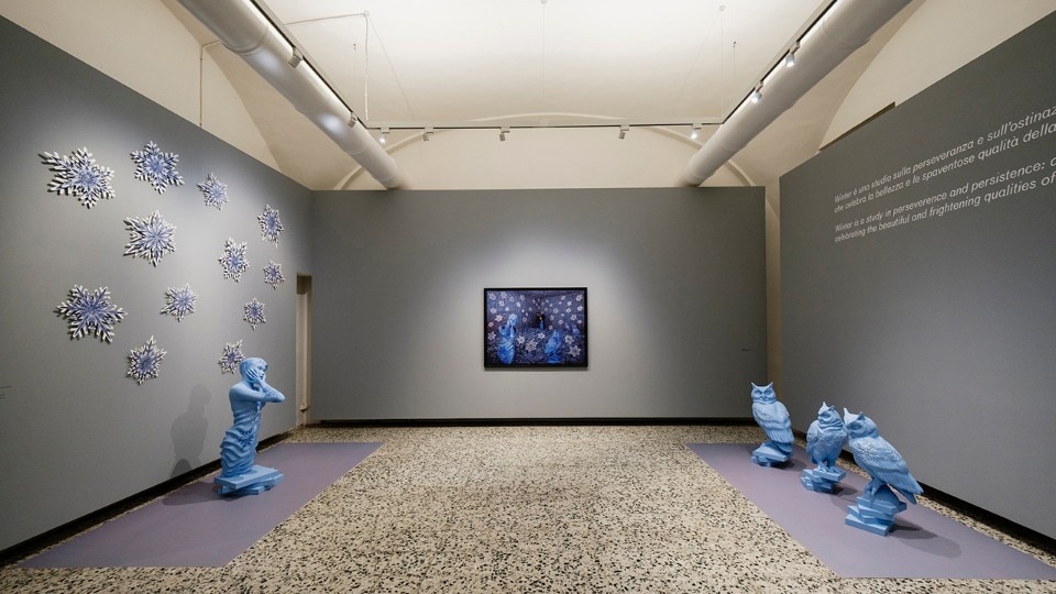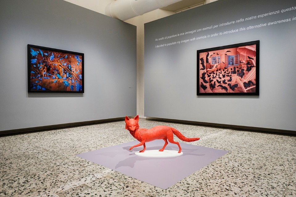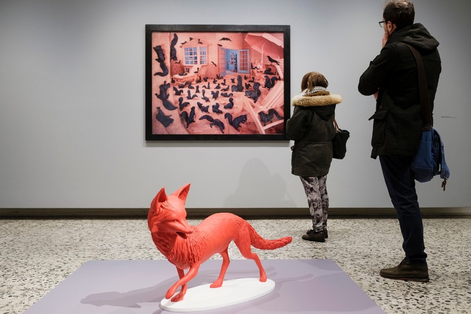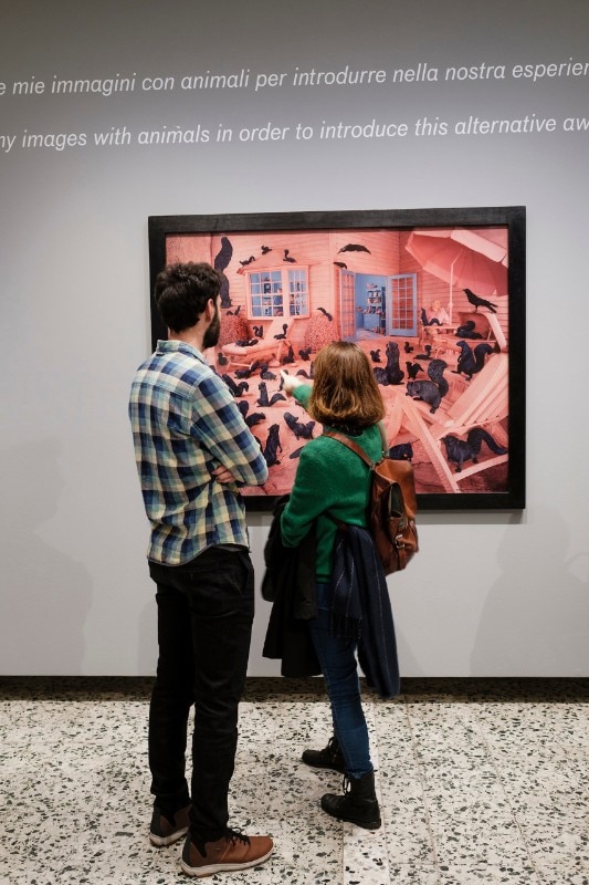 Gufi blu, gatti verdi radioattivi, serpenti attorcigliati e conigli su un pavimento di gusci di uova. “Non è così, forse, la vita che ci circonda? Questa è la condizione umana. Nel momento in cui veniamo alla luce, la realtà è uno shock, è un posto nuovo, pieno di ansia e di paure. E lo scopo dell’arte è diminuire quelle paure”. L’artista americana Sandy Skoglund, con oltre 60 anni di lavoro, risponde alle inquietudini di oggi con un immaginario fantastico che richiama il bestiario grottesco di Hieronymus Bosch e le dimensioni parallele di David Lynch. Per la prima volta in Italia, Camera. Centro Italiano per la fotografia le dedica un’antologica: “Sandy Skoglund. Visioni Ibride”, fino al 24 marzo. Cento lavori, fra fotografie (insieme a Jeff Wall e Cindy Sherman, Skoglund ha dato origine alla staged photography), installazioni e sculture provenienti dallo studio e da collezioni private italiane e straniere, con lavori raccolti fin dai suoi esordi artistici negli anni Settanta. Nata nel 1946 a Weymouth, Massachusetts, dopo aver studiato regia, incisione, e grafica, ha ricevuto il Master of Arts nel 1971 e Master of Fine Arts nel 1972. Si trasferisce a New York dove inizia a lavorare come artista concettuale, occupandosi di produzione artistica ripetitiva e orientata al processo, con gli anni si avvicina alla pratica artistica della fotografia e della ricostruzione scenografica. Esile, minuta ed estremamente composta, l’artista americana si aggira all’inaugurazione della mostra torinese, curata da Germano Celant, additando opere e raccontando l’ultima fatica, fino a quel momento inedita, Winter. Insieme a Fresh Hybrid, Winter è la seconda realizzazione del cicloThe Project of the Four Seasons. Si racconta ci abbia messo 10 anni per realizzarla.