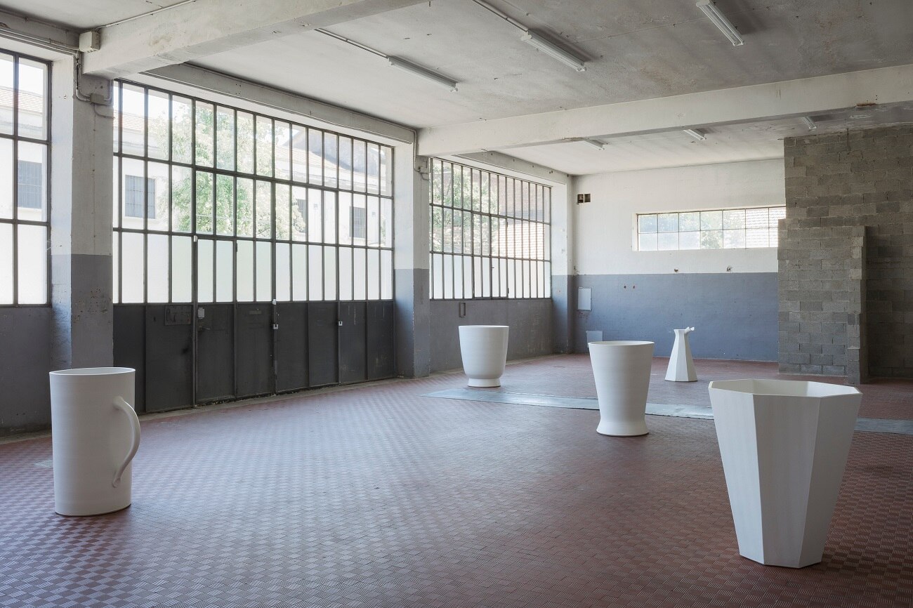 Per questa mostra ha concepito nuovi lavori, tutti realizzati sul tornio, per cui sono modellati come i loro rispettivi modelli più piccoli. E sono cotti in un forno gigantesco, che può contenerli uno alla volta. Lui lavora la base su tornio come pezzo unico, impiegando 10-12 kg di creta, e poi lo rifinisce a colombino. Però è incredibile, perché hanno superfici e spigoli, ad esempio, perfetti, lineari, sui quali però si riesce ancora a leggere la mano dell’uomo, attraverso piccole aree talvolta leggermente increspate. Specialmente qui, in questo spazio, perché con la luce radente l’occhio percepisce prima le imperfezioni, al di sotto dello smalto bianco, della ceramica. Tecnicamente questi enormi contenitori si potrebbero utilizzare, anche perché sono di gres e sono stati cotti due volte, come da tradizione. Inoltre, sono così bianchi, perché a lui interessa maggiormente la forma, rispetto alla decorazione. La sua cultura visiva di riferimento è minimale e concettuale. Lui ha compiuto molte ricerche sulle crete antiche, studiando i rossi, i marroni, i neri, i grigi, però qui ama concentrarsi sulla loro purezza.