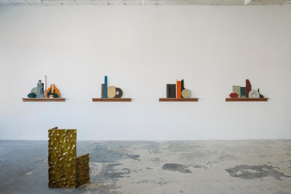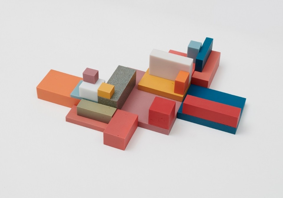 Lui impernia la propria pratica su due concetti principali, dai quali si discosta raramente. Uno è quello relativo allo scarto e poi ci sono queste forme minimale. I punti di partenza sono questi volumi colorati che si chiamano Leavings. Porzioni che rimangono dopo la lavorazione di un processo. Questa serie restituisce l’idea di una pratica formata da tante stazioni, da catene di metodologie da applicare. Lui parte dall’utilizzo di una particolare ceramica, chiamata Parian, che Wedgewood aveva già inventato e usato tantissimo. L’idea è che abbia il nitore del marmo di Paros. È molto affascinante perché i pigmenti di queste miniature sono impastati tutti con metalli e non sono smaltati.
