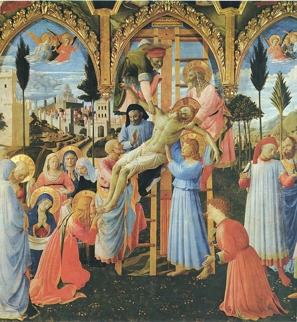 La foto, scattata da André Luis Alves, freelance portoghese, immortala il trasferimento dalla cattedrale. Non è la prima volta che accade, la scultura fu portata via già durante la Seconda Guerra Mondiale. Nel Museo di San Marco, a Firenze, c’è un’opera straordinaria: La Deposizione dalla Croce del Beato Angelico. Stessa scena, stessa possa, stesso dolore e una corte di persone che sostiene il corpo del Cristo. In alto un uomo sorregge il corpo per un braccio, così come nella foto, a destra invece ancora un’altra figura occupa indaffarato la scena mentre ai suoi piedi altre lo piangono. Nella foto, esattamente come nella foto.