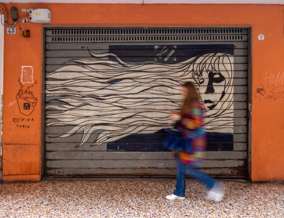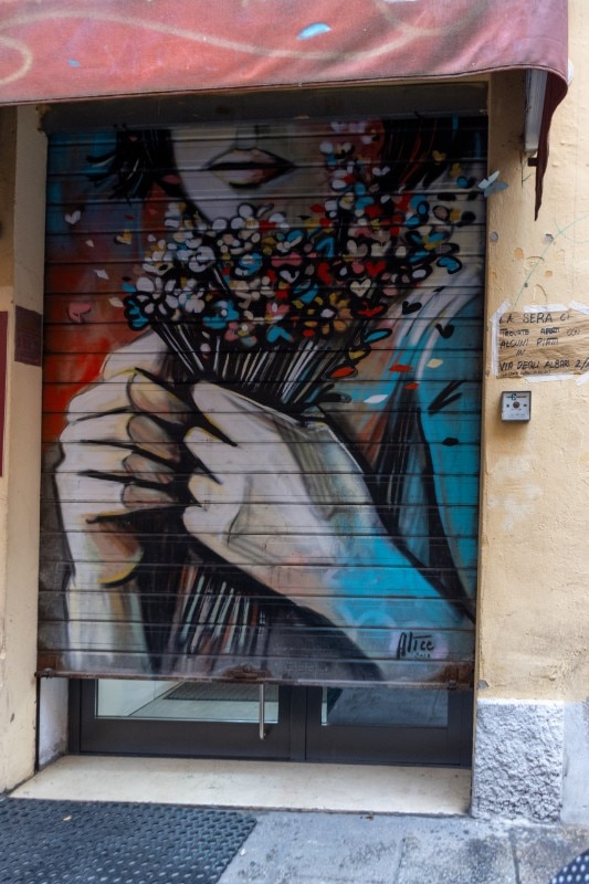 Su una delle saracinesche di via Pratello, Alicè ha raffigurato una ragazza con un mazzo di fiori colorati in mano che nasconde una parte del viso dietro la tenda, ricordando che quella di strada “è un’arte che scatena polemiche” e nel corso della sua carriera i problemi non sono di certo mancati, ma riconosce che dopotutto “è il rischio di firmarsi con il proprio nome”.
