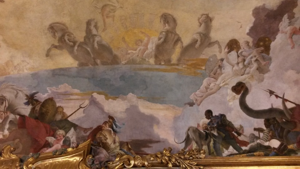 E poi viene la strofa più difficile, quella in cui Paoli non descrive più lo spazio ma il tempo: "Io vedo il cielo sopra noi /che restiamo qui, abbandonati come se/ non ci fosse più / niente, più niente al mondo.." Lo spazio senza pareti diventa tempo senza fine. È il problema che Tiepolo affronta nelle grandi volte del Settecento. Nelle sue aperture celesti il tempo si sospende in una luminosità che non appartiene né al mattino né alla sera, una luce che sembra non avere ora, non avere stagione. Gli dei volano leggeri come se la gravità fosse un'opinione, i colori hanno la qualità dell'eterno-adesso. Tiepolo sa che il cielo affrescato è la più nobile delle menzogne, quella che serve a chi abita quelle stanze per credere, almeno mentre alza gli occhi, che il tempo si sia fermato. Che non ci sia confine.
