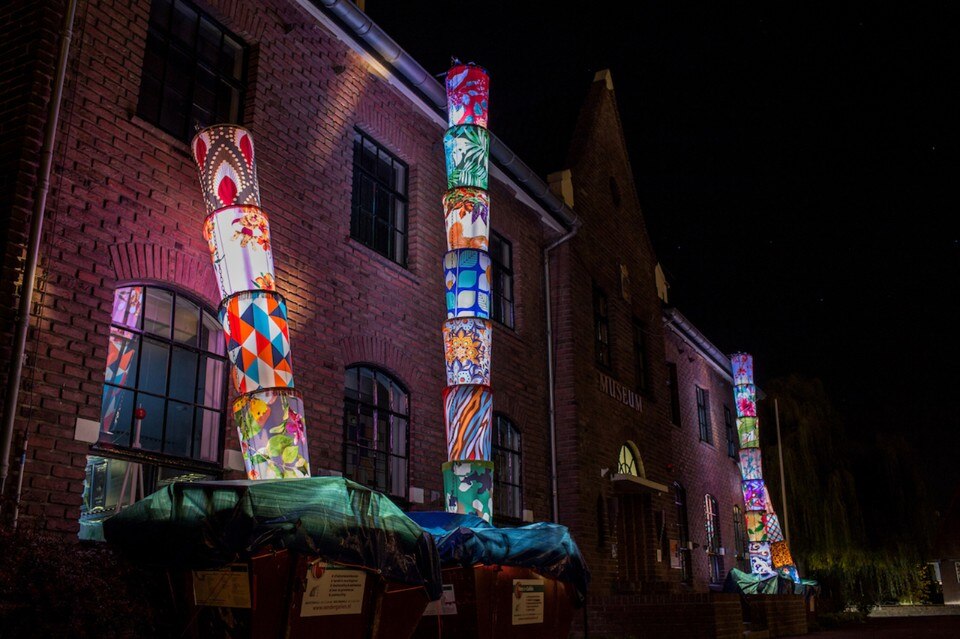 I tubi ricordano quelli per lo scarico delle macerie utilizzati comunemente nei cantieri edilizi. Gli artisti sostituiscono la plastica con tessuti colorati e dai diversi motivi ornamentali. Le lampade urbane portano l’arte del museo all’esterno e diventano degli elementi di attrazione.