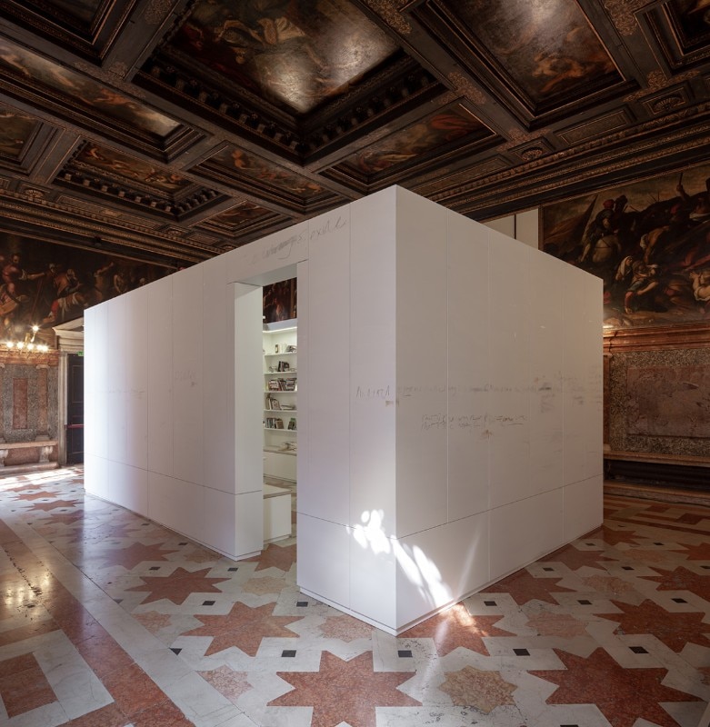 Ho una lunga relazione con il Museo Ebraico, che ho visitato numerose volte. Mi colpisce il senso di crescita, della molteplicità di storie che racchiude, delle numerose voci presenti all’interno di questo edificio. La seconda parte della mostra si trova all’Ateneo Veneto, uno storico luogo d’incontri e dibattiti della vita intellettuale della città, un luogo di scambio democratico. Per queste ragioni ho pensato che fosse il posto ideale per la costruzione della mia biblioteca, un luogo che si presta alla riflessione sulla storia della letteratura in esilio.