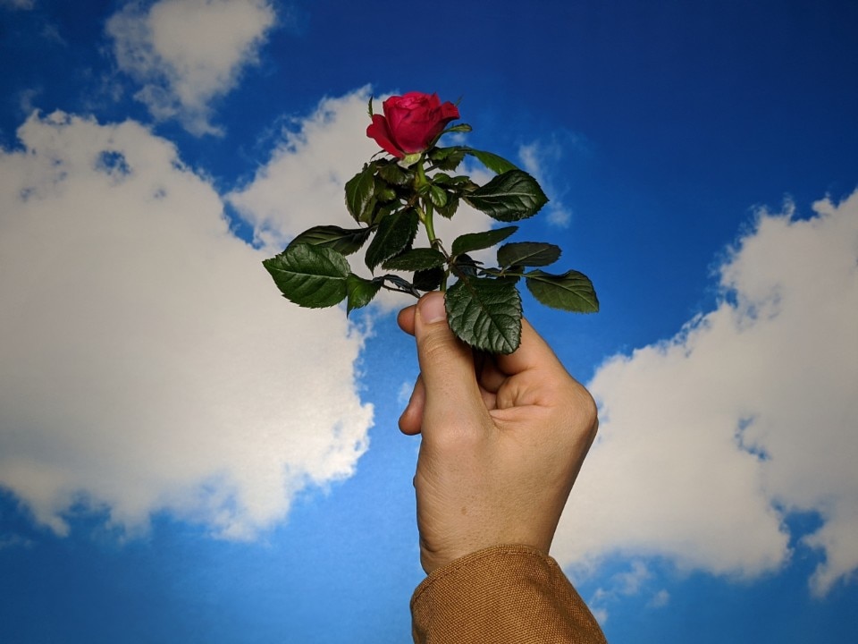 La stanza, la torta e la rosa rossa sono tre set differenti con zero luce naturale. Nelle prime due era voluto, nella terza il risultato è stato una luce surreale. C’era l’intenzione di simulare luce diurna al buio, quindi è andata ancora meglio di quello che avevo immaginato. In realtà questo scatto è un controluce, il cielo è una velina a cui ho puntato una luce per eliminare le ombre. Il rischio sarebbe potuto essere tante ombre e qualche problema con i colori. Incredibilmente con il Pixel si sono eliminate le ombre e ho mantenuto la brillantezza nei colori.