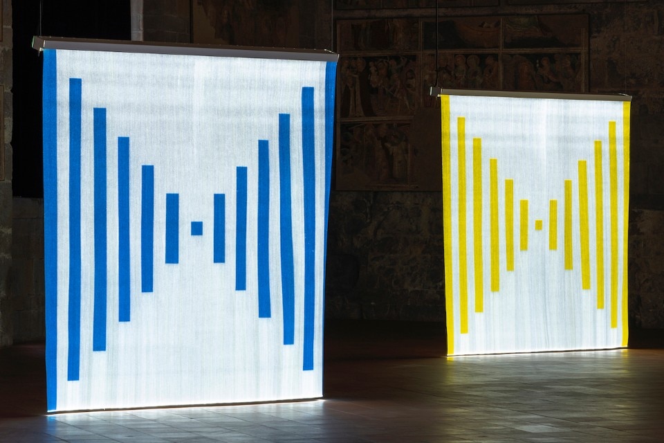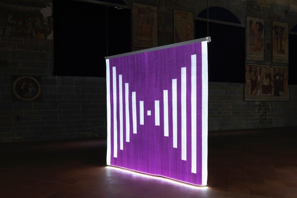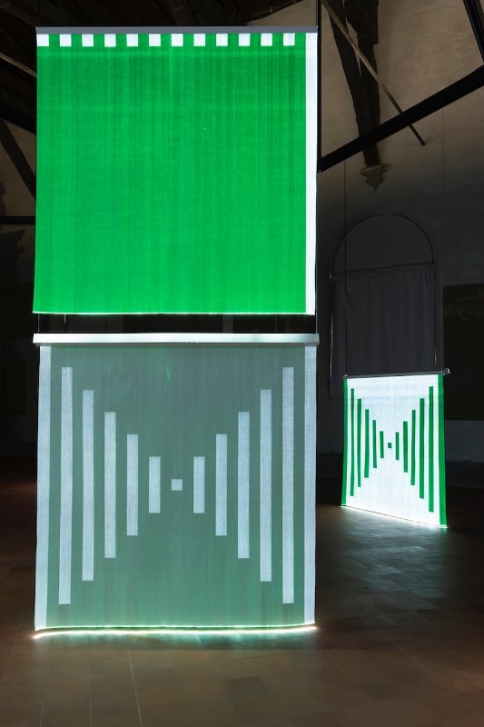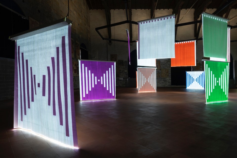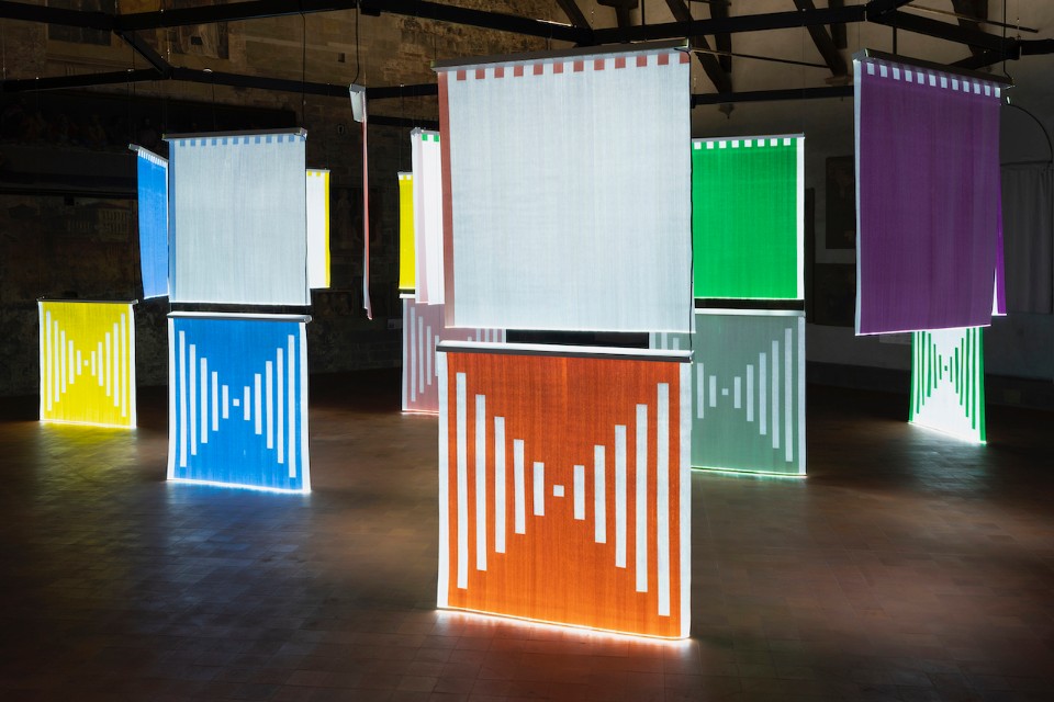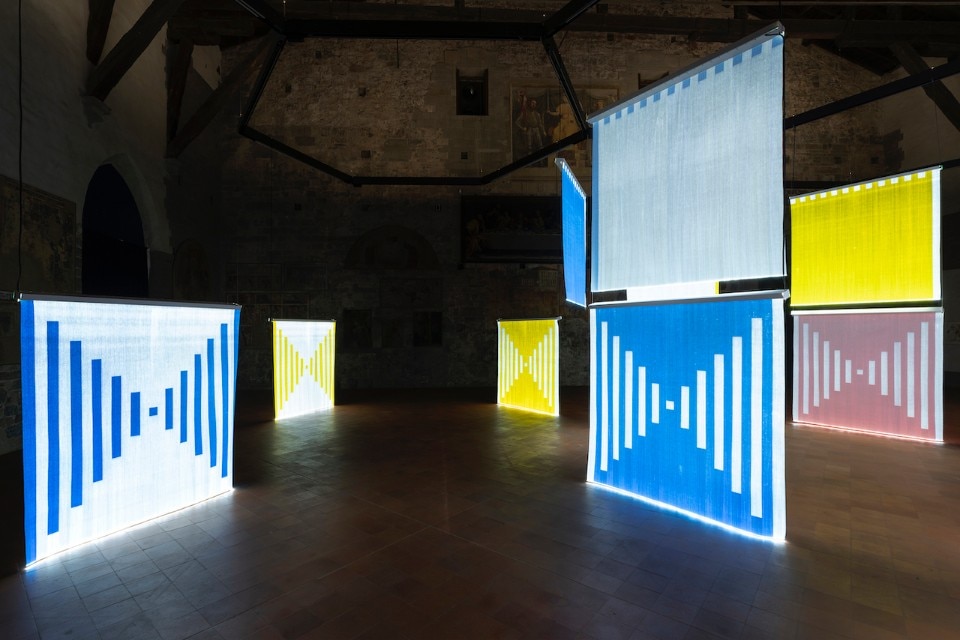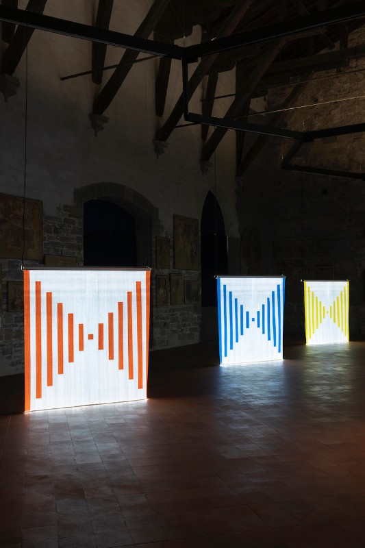 A distanza di oltre 50 anni da quella data, Daniel Buren invade con la sua “pittura ready made” la Sala delle Capriate di Palazzo della Ragione di Bergamo: Daniel Buren. Illuminare lo spazio, lavori in situ e situati, mette in mostra una produzione che si rinnova nel tempo, pur mantenendosi sempre fedele a se stessa. L’artista torna a proporre i suoi motivi a bande verticali bianche e colorate, ciascuna della larghezza di 8.7 cm, mentre espone per la prima volta in un museo italiano opere che impiegano la fibra ottica, la quale permette a ogni singola installazione di sprigionare una luce che va a impattare sulle antiche forme del Palazzo e sugli affreschi in esso conservati, rimodellando gli ambienti storicamente destinati all’amministrazione e all’esercizio della giustizia cittadina. Importante è anche la distinzione tra la definizione “in situ” e “situati”: la prima definisce quell’accezione solitamente chiamata “site specific”, ovvero elaborare un’opera appositamente per un dato contesto. “Situato”, invece, definisce installazioni adattate agli spazi del grande salone, seppur idealmente trasferibili in altri luoghi.