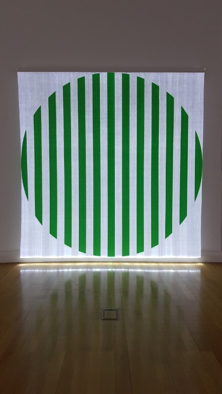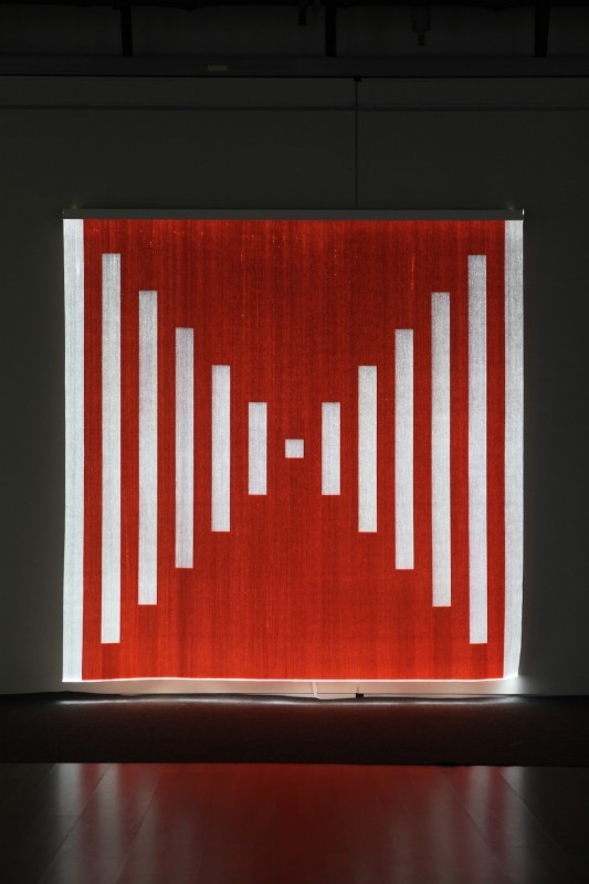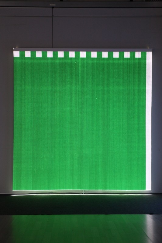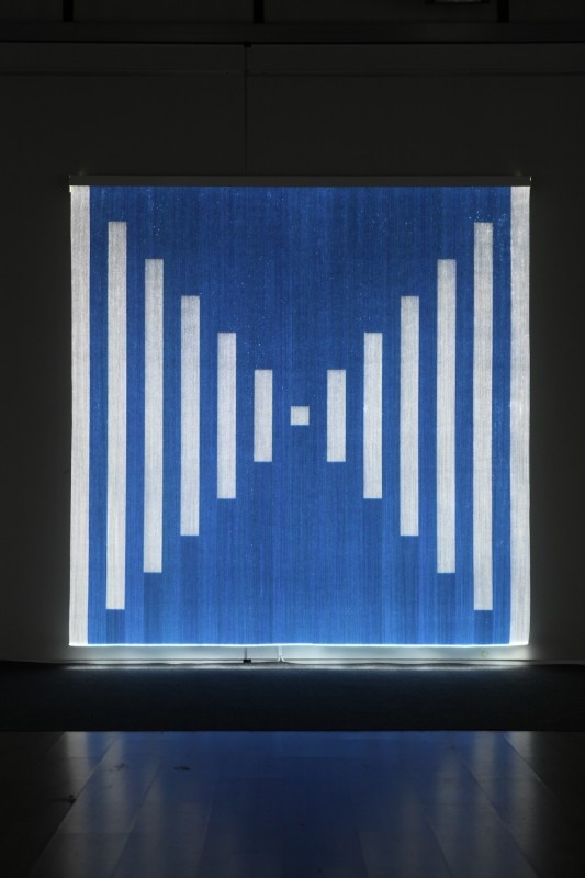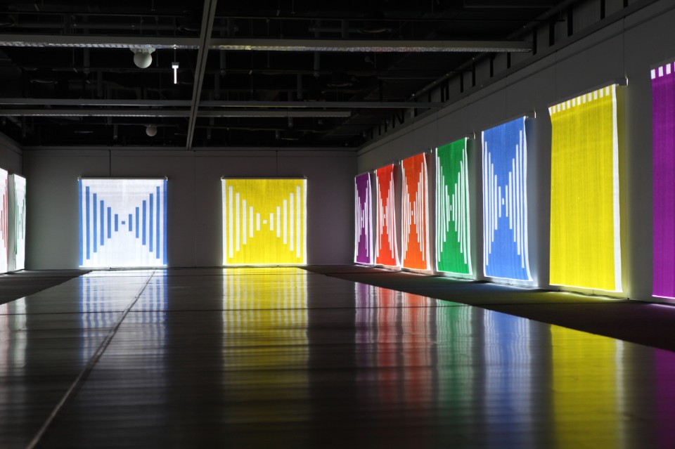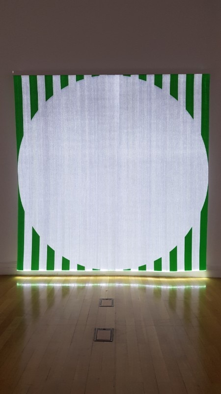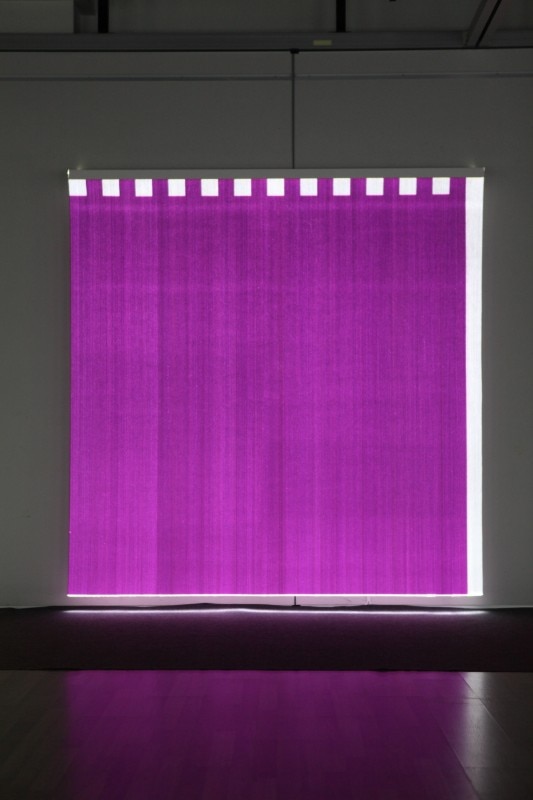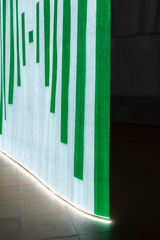 A distanza di oltre 50 anni da quella data, Daniel Buren invade con la sua “pittura ready made” la Sala delle Capriate di Palazzo della Ragione di Bergamo: Daniel Buren. Illuminare lo spazio, lavori in situ e situati, mette in mostra una produzione che si rinnova nel tempo, pur mantenendosi sempre fedele a se stessa. L’artista torna a proporre i suoi motivi a bande verticali bianche e colorate, ciascuna della larghezza di 8.7 cm, mentre espone per la prima volta in un museo italiano opere che impiegano la fibra ottica, la quale permette a ogni singola installazione di sprigionare una luce che va a impattare sulle antiche forme del Palazzo e sugli affreschi in esso conservati, rimodellando gli ambienti storicamente destinati all’amministrazione e all’esercizio della giustizia cittadina. Importante è anche la distinzione tra la definizione “in situ” e “situati”: la prima definisce quell’accezione solitamente chiamata “site specific”, ovvero elaborare un’opera appositamente per un dato contesto. “Situato”, invece, definisce installazioni adattate agli spazi del grande salone, seppur idealmente trasferibili in altri luoghi.