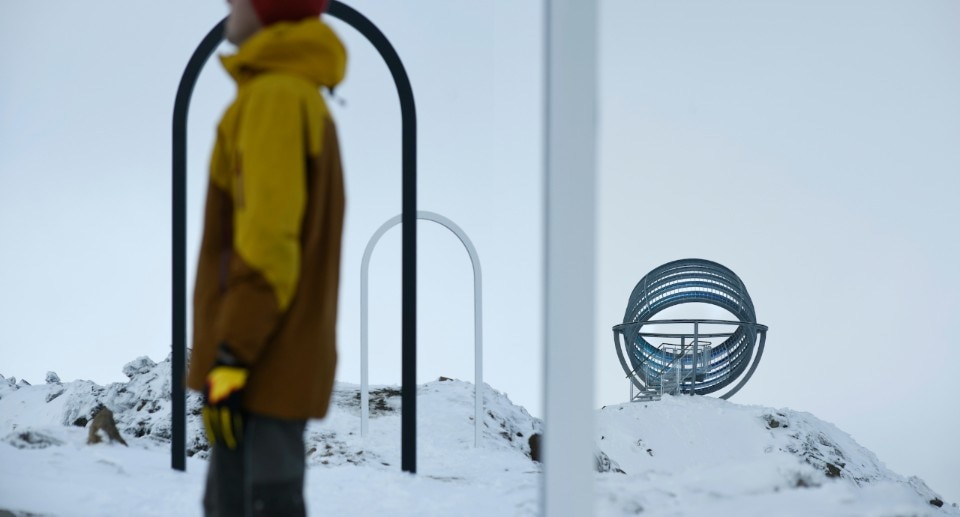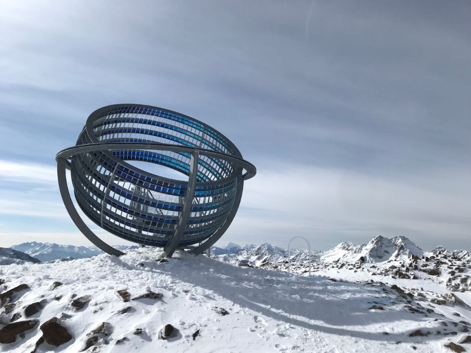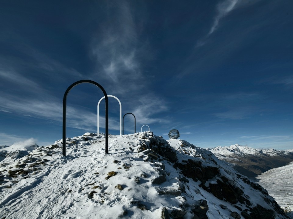 Il percorso in pendenza è ritmato da nove archi metallici, e porta al punto fondamentale dell’istallazione: un dispositivo costituito da più anelli di acciaio e vetro che si protende oltre l’orlo del Monte Grawand. In piedi sulla piattaforma, lo spettatore può utilizzarlo come strumento astronomico, puntando lo sguardo sugli anelli circostanti, che seguono il percorso apparente del sole nel cielo, in un dato giorno. Gli anelli, infatti, dividono l’anno in intervalli di tempo uguali: l’anello superiore segue il percorso del sole nel solstizio d’estate; l’anello centrale segue l’equinozio; e l’ultimo il solstizio d’inverno. Ogni anello è a sua volta suddiviso in lastre di vetro rettangolari che coprono un arco di 15 minuti del movimento del sole attraverso il cielo, consentendo allo spettatore di determinare l’ora del giorno in base alla posizione del sole.