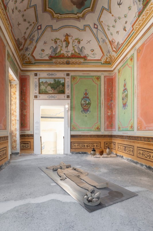 Spicca anche il lavoro di Giuseppe Stampone, nativo abruzzese che nelle sue opere ripercorre a suon di tratti di penna Bic la storia artistica della regione (ricalcando il concetto nel titolo Aprutium, 2023). Meno diretti ma altrettanto incisivi sono gli echi più trasversali presenti nei lavori tessili (Xanî Xanî Xanî, 2021) e fotografici (The Owl’s Made a Nest in the Ruins of the Heart: Film Still I, 2021) dell’artista iraniana Shadi Harouni, che riflettono sulla crescente crisi abitativa e migratoria frutto di promesse politiche infrante, e in quelli della statunitense Eleanor Antin, una serie fotografica di grande formato “Roman Allegories” (2004) che riflette con sarcasmo sull’idea di rovina in una contemporaneità in declino. Tra memoria e oblio, permanenza e provvisorietà, si ritrova anche Il Sogno dello Spigolo (2023) di Paolo Icaro. Il lavoro è pensato ad hoc per il cortile interno del settecentesco Palazzo Ardinghelli, sede del Maxxi (che attualmente espone in mostra i meravigliosi lavori di Marisa Merz e Shilpa Gupta) e consiste in un ironico spigolo adagiato su due cuscini. “Sento di partecipare allo spirito di ricostruzione”, afferma Icaro, consapevole che ci sia ancora molto lavoro da fare a L’Aquila.