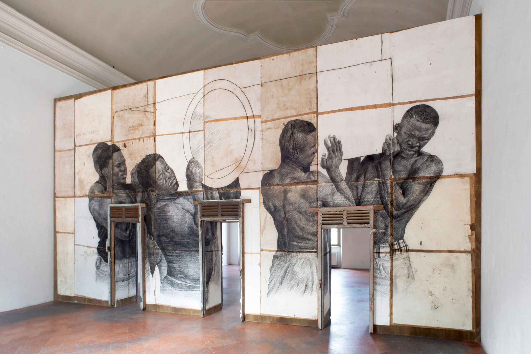 APalazzoGallery presenta fino al 22 settembre la mostra dell’artista ghanese Ibrahim Mahama, intitolata If These Are The Things. Si tratta della quarta personale dell’artista con la galleria, e raccoglie un ricco nucleo di opere inedite, con disegni a carboncino, fotografie e una monumentale installazione composta da frammenti di vecchi soffitti in compensato dipinto e porte in legno. La sua riflessione sui temi della crisi e del fallimento trova espressione anche in questa occasione, in materiali che richiamano la transizione globale e il funzionamento delle strutture capitalistiche.