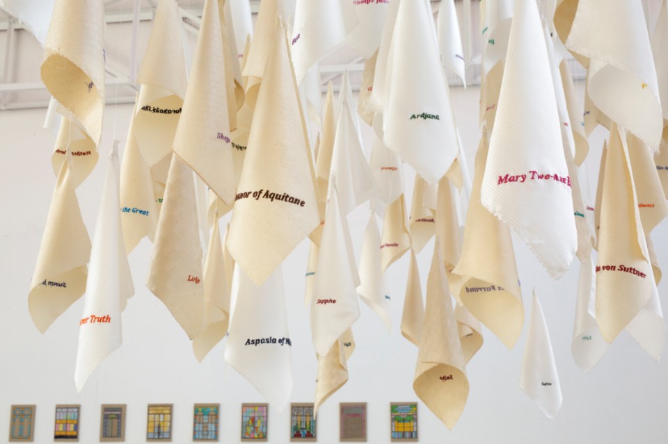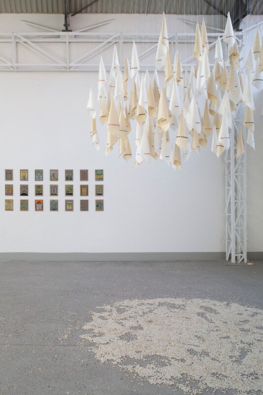 Ma il mondo dell’artista/designer non si ferma qui: Anila proietta sul suo lavoro, sul suo vagare e intrecciare, anche esplicite intenzionalità politico-sociali. Sempre nella mostra milanese si può apprezzare ad esempio il progetto Ain’t I a Woman? che attraverso la collaborazione con un gruppo di donne della comunità rom di Durazzo, in Albania (un gruppo molto vulnerabile, che soffre di povertà, razzismo e discriminazione) mette in luce le lotte condivise dalle donne di generazione in generazione. Come per un atto di restituzione e riconoscimento, Anila ha chiesto alle donne rom di ricamare su 100 fazzoletti i nomi di donne che hanno dato il loro contributo, spesso trascurato, alla lotta per l’emancipazione e la liberazione femminile (da Miriam Makeba a Shirin Ebadi). Poi ha ricamato lei stessa su altri fazzoletti i nomi delle donne rom che avevano realizzato i precedenti ricami. Nella mostra i fazzoletti di seta bianca sono sospesi nell’aria, come dice il curatore sembrano quasi “uno stormo di uccelli o una nuvola sognante”, mentre il pavimento è coperto di fagioli (“in 50 anni di comunismo – dice Anila – erano l’unico alimento per saziare la pancia”), quasi a rendere il movimento difficile, costringendo il visitatore a trovare un equilibrio a ogni passo.