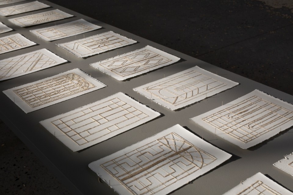 Per anni Anila ha fotografato le seconde porte dei palazzi di Milano, e ha fatto di quelle immagini il suo taccuino, i suoi appunti di viaggio. Da quelle fotografie che ritraggono porte importanti, non solo per la grandezza (ci sono porte di 7metri x 5, o di 9 x7), Anila Rubiku ha ricavato 135 disegni che poi sono diventati le tele intrecciate con fili di seta che sono esposte in mostra. In queste tele – come scrive il curatore della mostra Edi Muka – “i confini fra architettura ed emozione si fondono in delicati ricami di ricordi ed esperienze e il progetto diventa una sorta di lettera d’amore alla città, scritta non con le parole ma intessuta con fili e colori”. E’ un mondo filiforme quello di Anila Rubiku, dove design, decorazione e ricamo confluiscono in sorprendenti arazzi tessili di rara eleganza e bellezza.