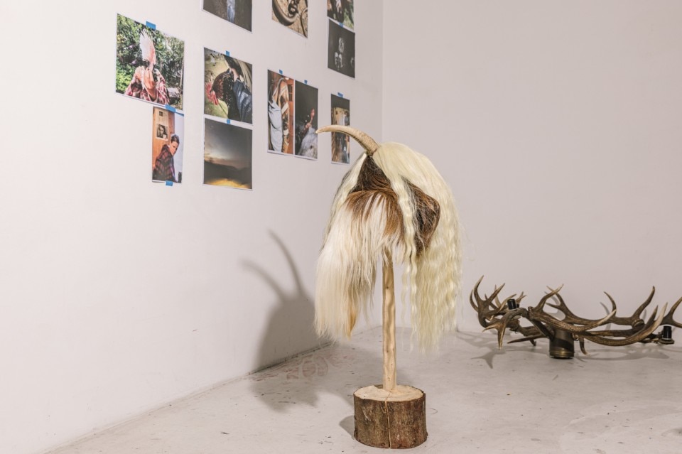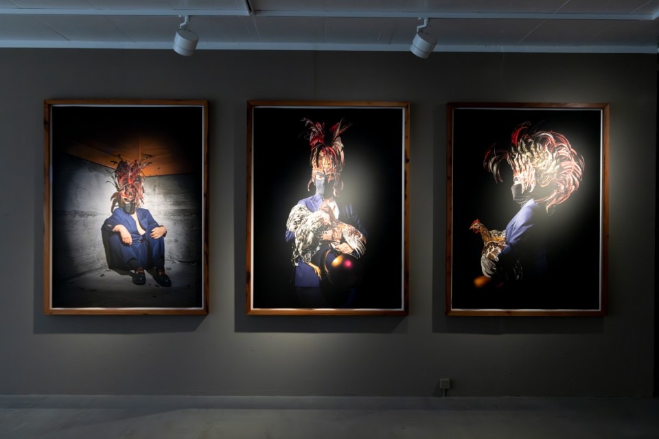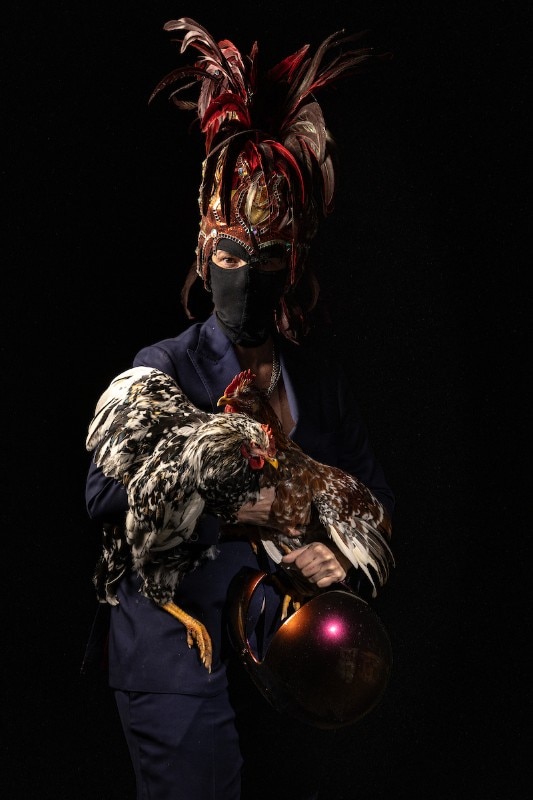 Sulla parete più lontana rispetto alla porta d’ingresso della Fondazione, ma al tempo stesso in una posizione di grande visibilità appena si entra nella sala principale della mostra, c’è un trittico di foto in cui Sandra Knecht indossa un copricapo a forma di testa di gallo. È in realtà un elmo, spiega lei. E in qualche modo in quelle immagini c’è la chiave di lettura di tutta la mostra. “Sono una donna queer cresciuta tra le montagne, in un piccolo paese”, mi spiega – e me lo spiega in tedesco, tornando più volte sulla spiegazione e sui dettagli, segnale che per lei questo è un racconto fondamentale e anche fondativo. In un contesto del genere, “ti vedono come una drag queen”. Il gallo, con cui è ritratta in un’altra grande foto della mostra, animale per lei archetipico, non è semplicemente un travestimento, ma una protezione. “Quella testa di gallo è un elmo che ti protegge”.