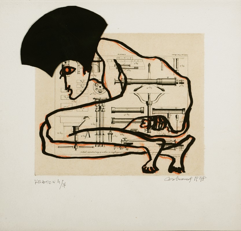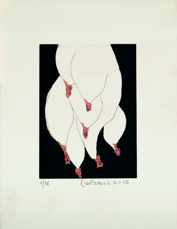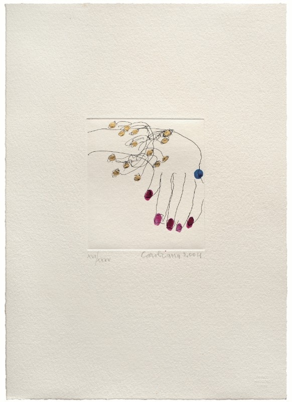 Carol Rama interviene sui fogli stampati centellinando il colore di acquerelli o smalti per unghie, scherzando all'infinito sull'austerità di un foglio che dovrebbe, secondo le regole della calcografia tradizionale, restare intoccato.