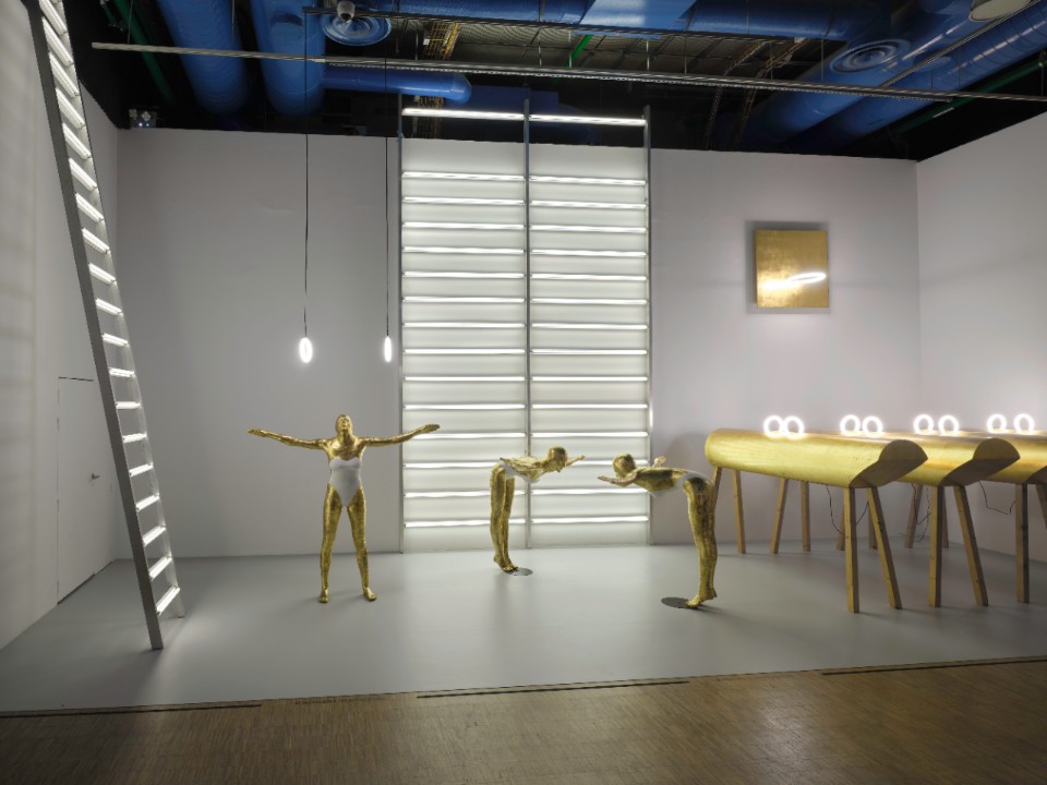 Dopo il focus sugli esordi, il Pompidou non manca di orientare lo sguardo su alcune tra le opere più note, tra cui spicca la riproposizione di alcune grandi installazioni. Non è però il caso della Strada Novissima, forse la sua installazione più celebre, realizzata per la prima Biennale di Architettura del 1980 a cura di Paolo Portoghesi, dove Hollein reinterpretò il tema de “La forma del passato” con un passaggio storicizzante sulla figura della colonna: “transFORMS” la racconta solo attraverso foto e schizzi preparatori. Piuttosto, la mostra ci regala l’opportunità di rivivere Die Turnstunde, la lezione di ginnastica, installazione realizzata nel 1984 presso il museo di Mönchengladbach – anch’esso un progetto di Hollein – nella quale i manichini-atleti rivestiti in finitura dorata sono stesso tempo l’eco dell’uomo vitruviano e l’esaltazione di una fisicità gloriosa e sensuale.